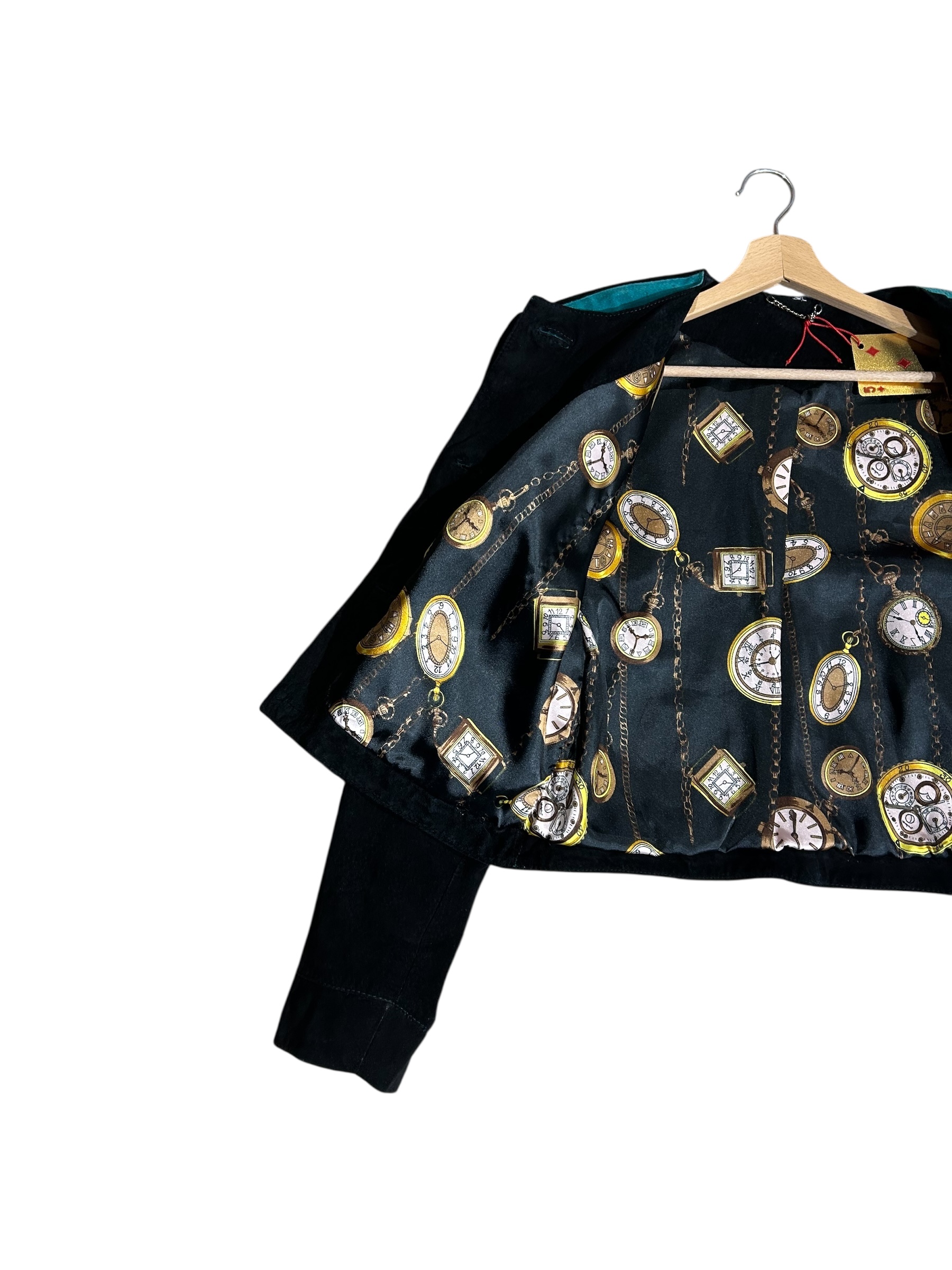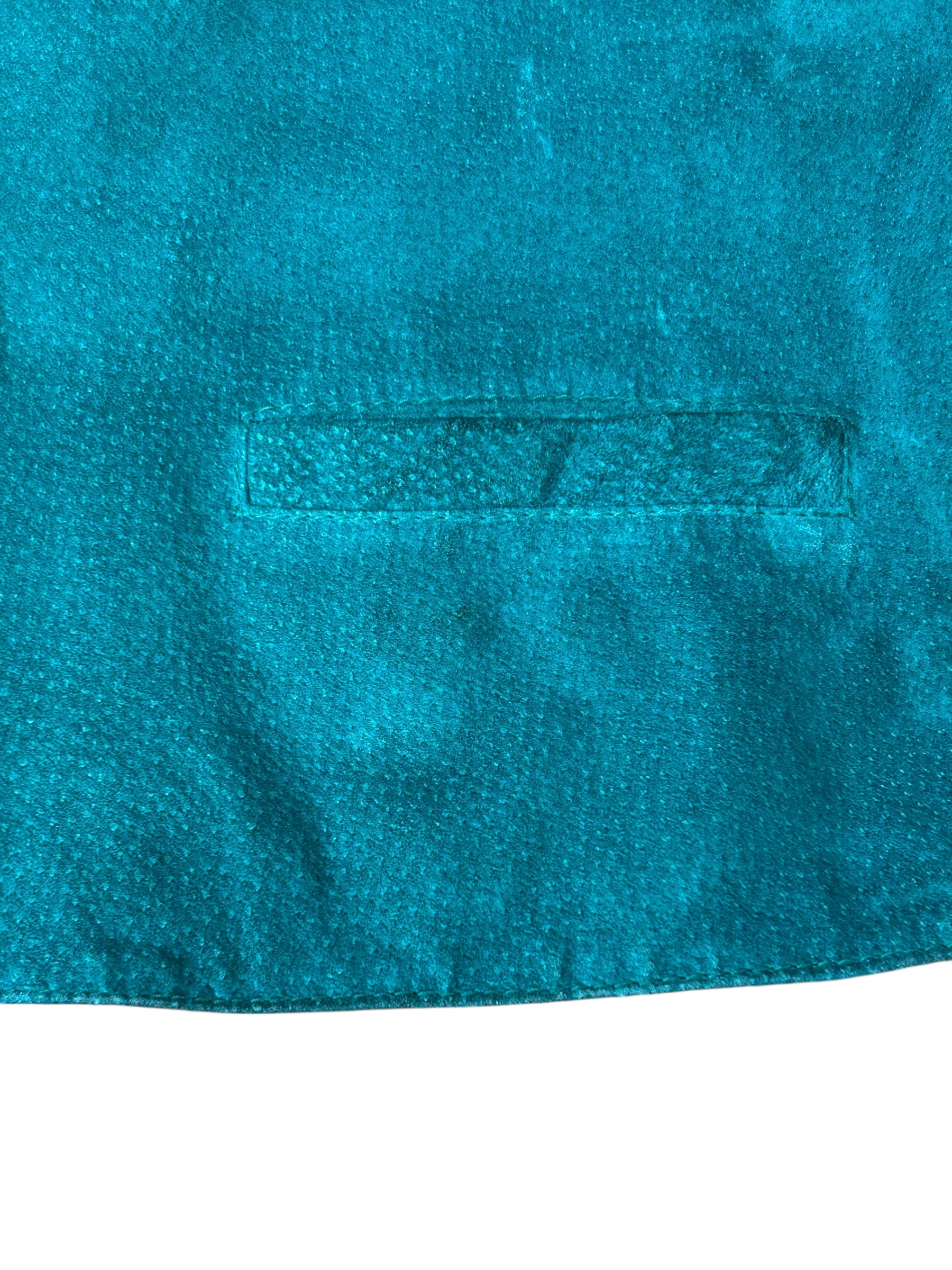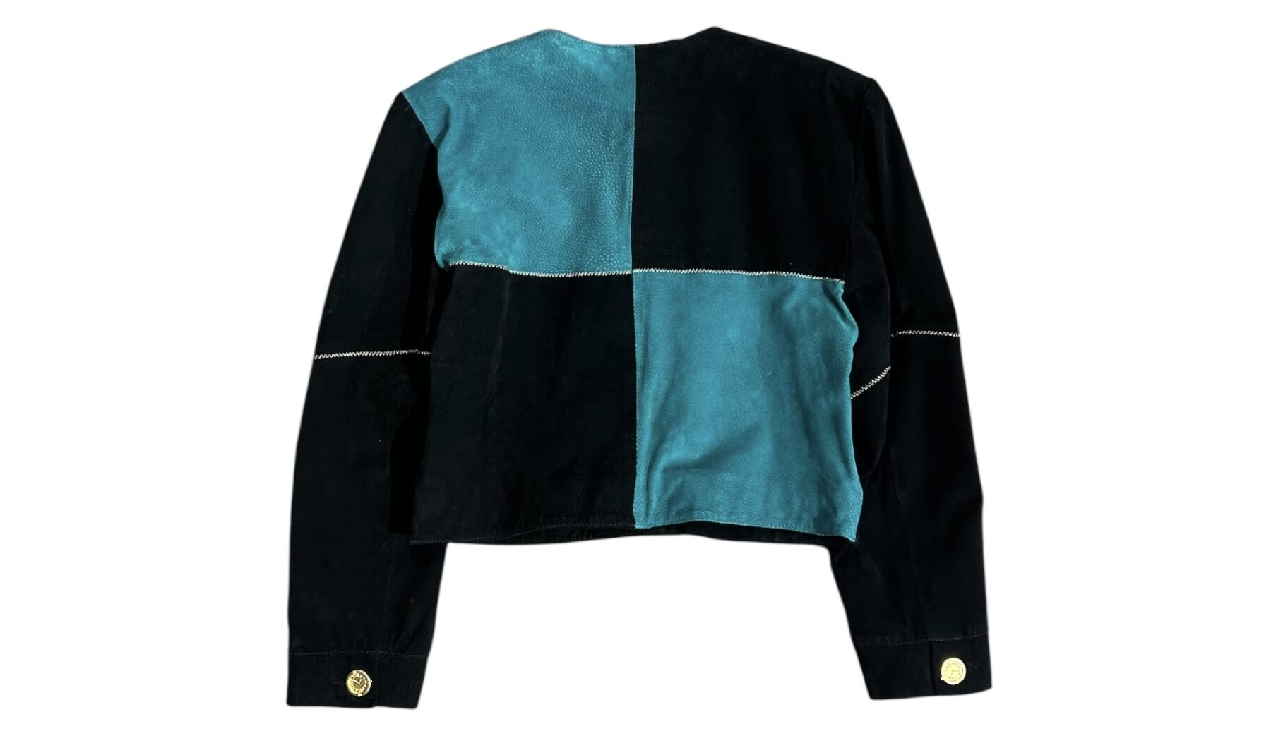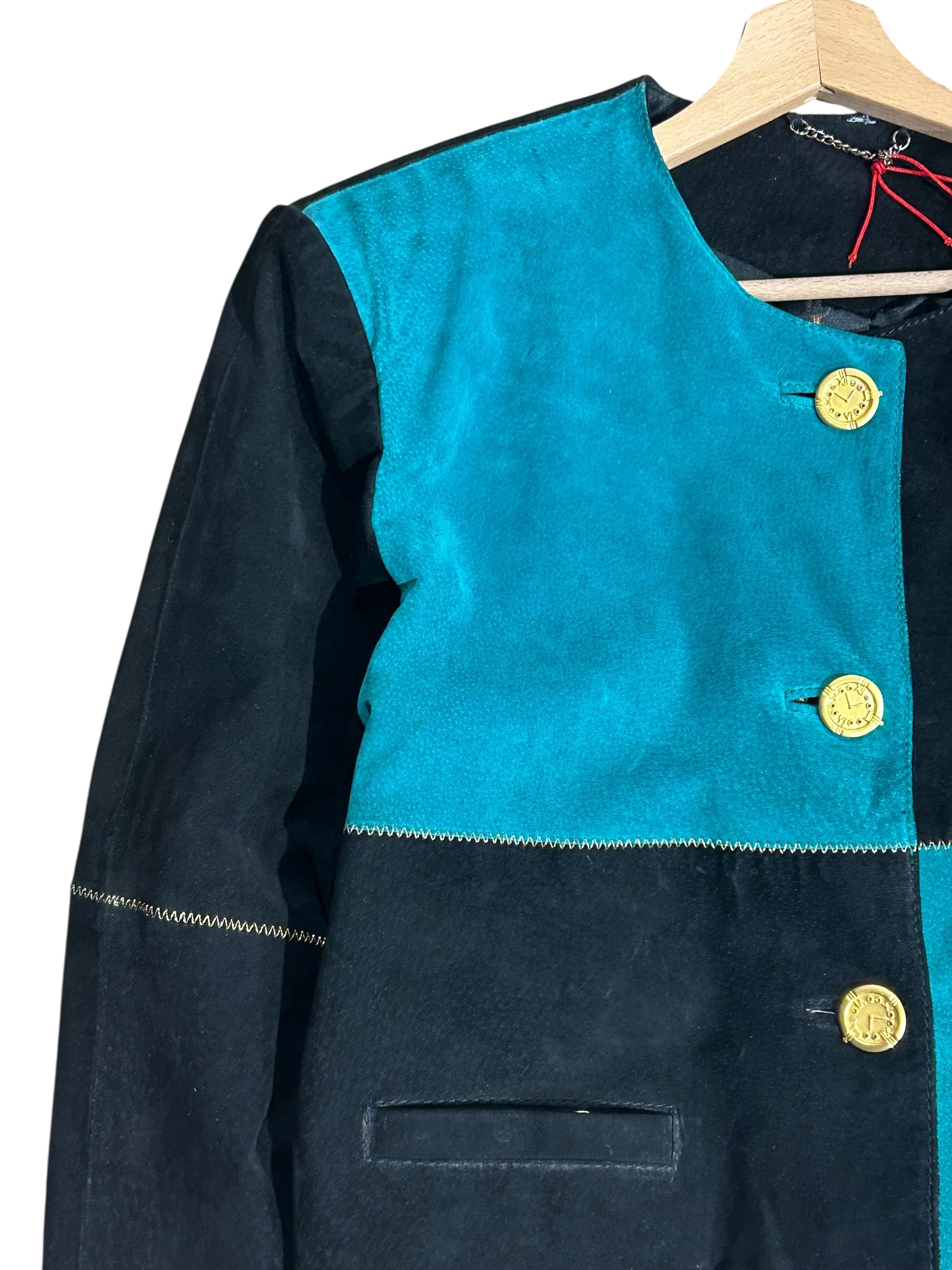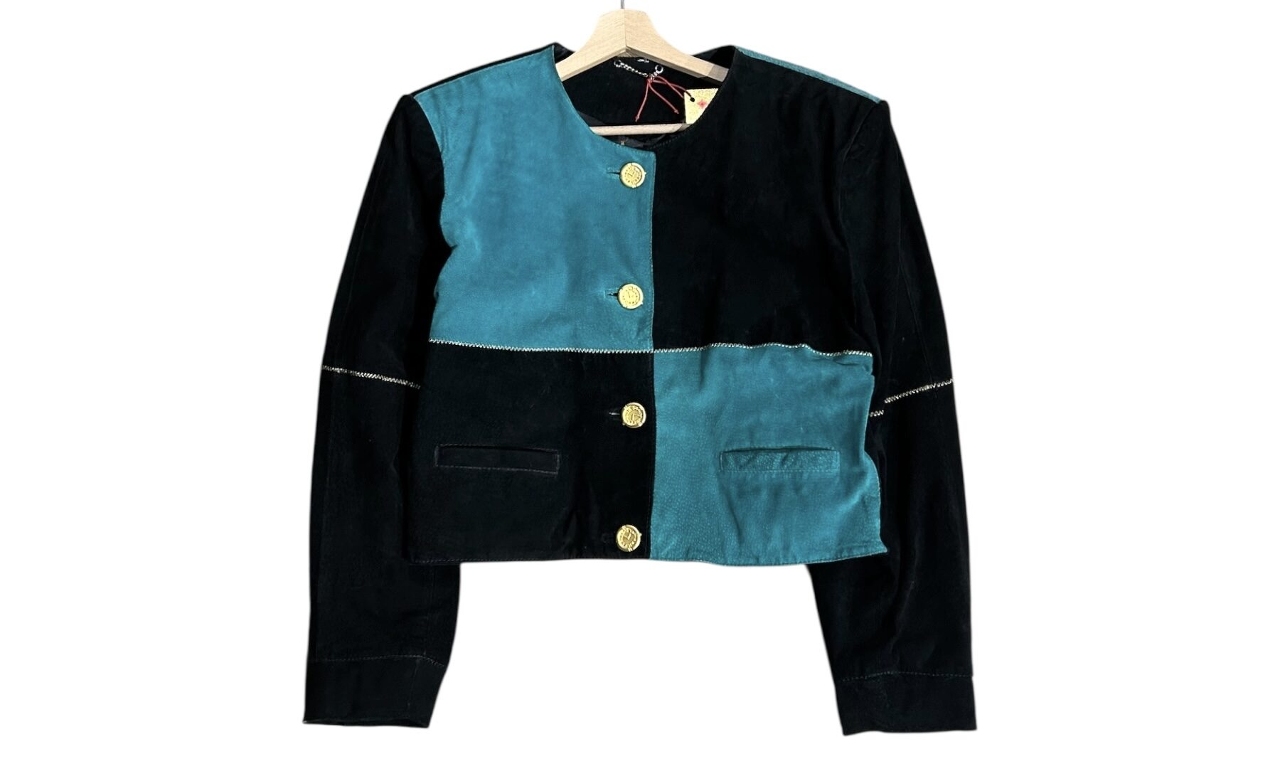 Kurtka wykonana z wysokiej jakości zamszu, o kroju sięgającym bioder. Utrzymana w pięknym turkusowym kolorze, wyróżnia się wyjątkowymi detalami – zegarowymi guzikami zdobionymi kryształkami, które nadają jej niepowtarzalnego charakteru. Wnętrze zostało wykończone oryginalną, efektowną podszewką, a starannie obszyte szwy podkreślają jakość i precyzję wykonania.