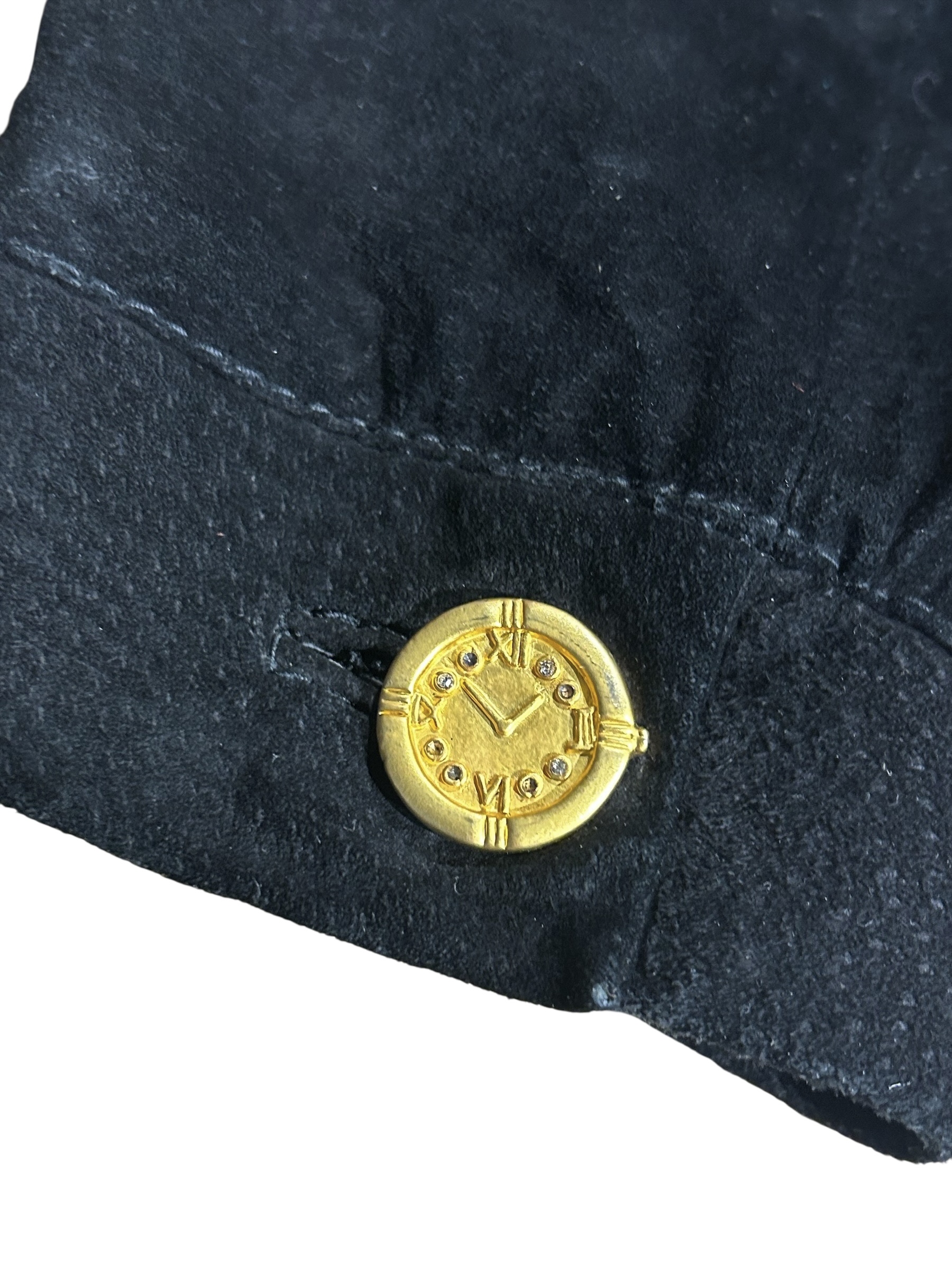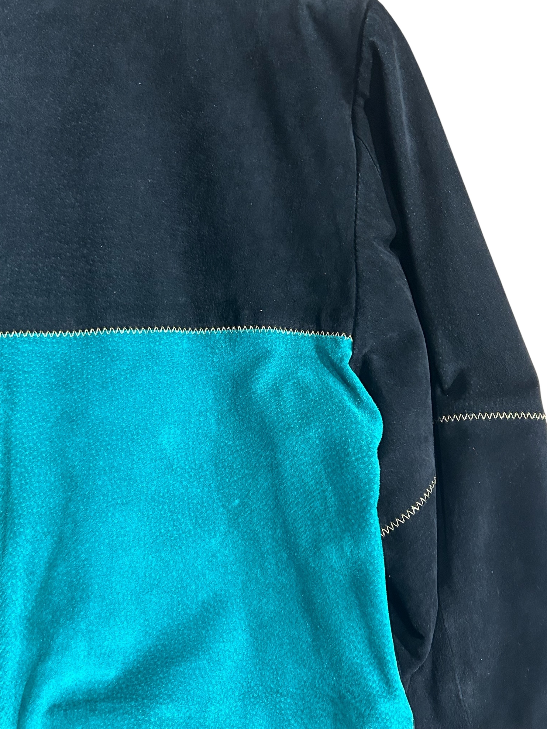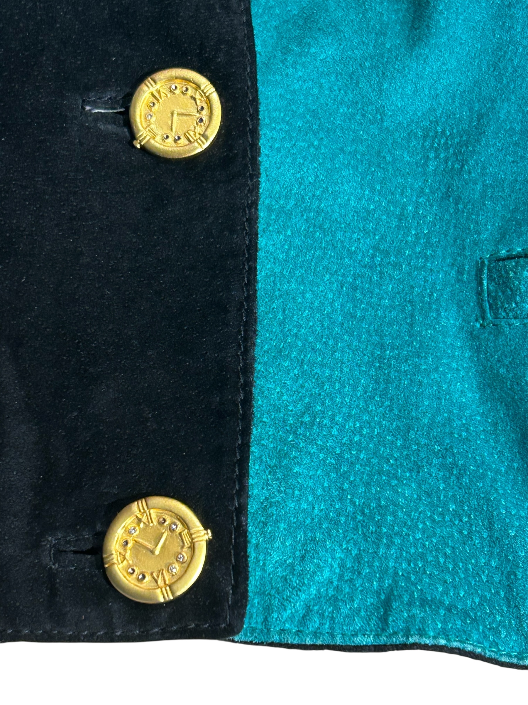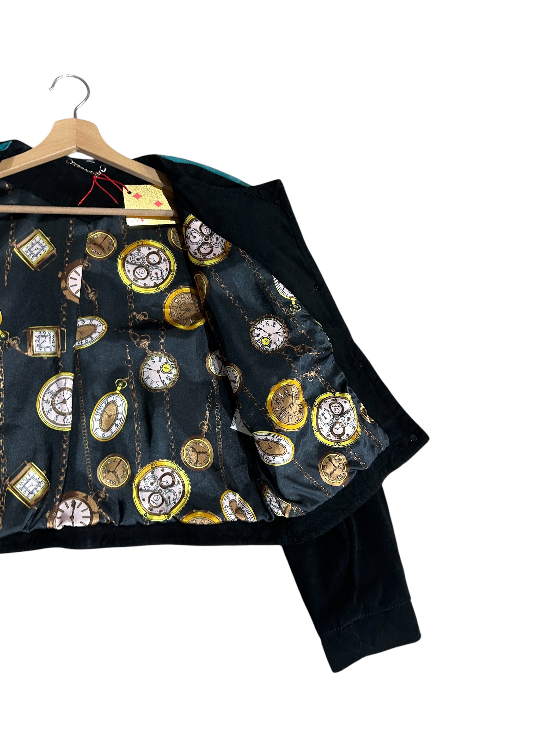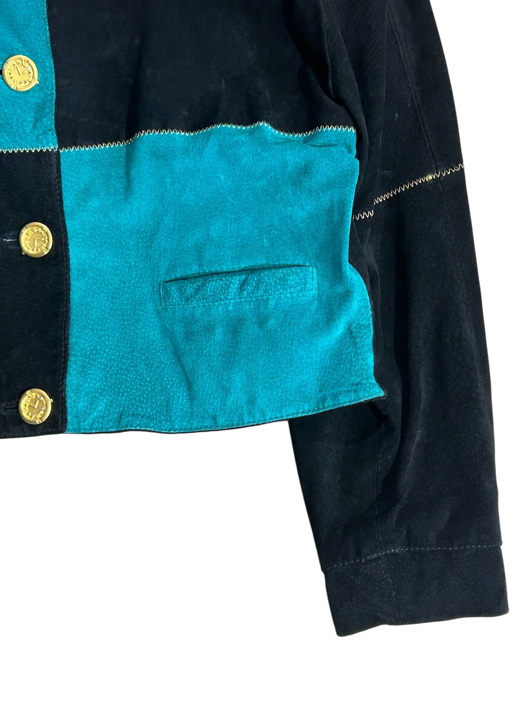Kurtka wykonana z wysokiej jakości zamszu, o kroju sięgającym bioder. Utrzymana w pięknym turkusowym kolorze, wyróżnia się wyjątkowymi detalami – zegarowymi guzikami zdobionymi kryształkami, które nadają jej niepowtarzalnego charakteru. Wnętrze zostało wykończone oryginalną, efektowną podszewką, a starannie obszyte szwy podkreślają jakość i precyzję wykonania.