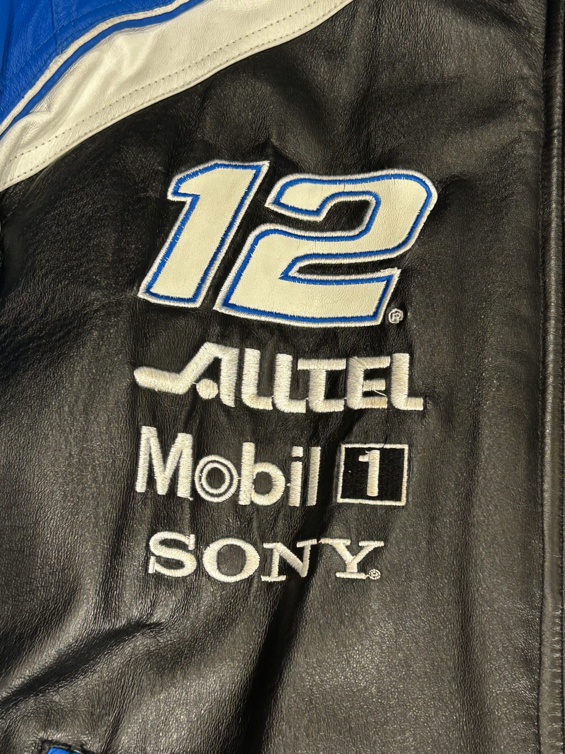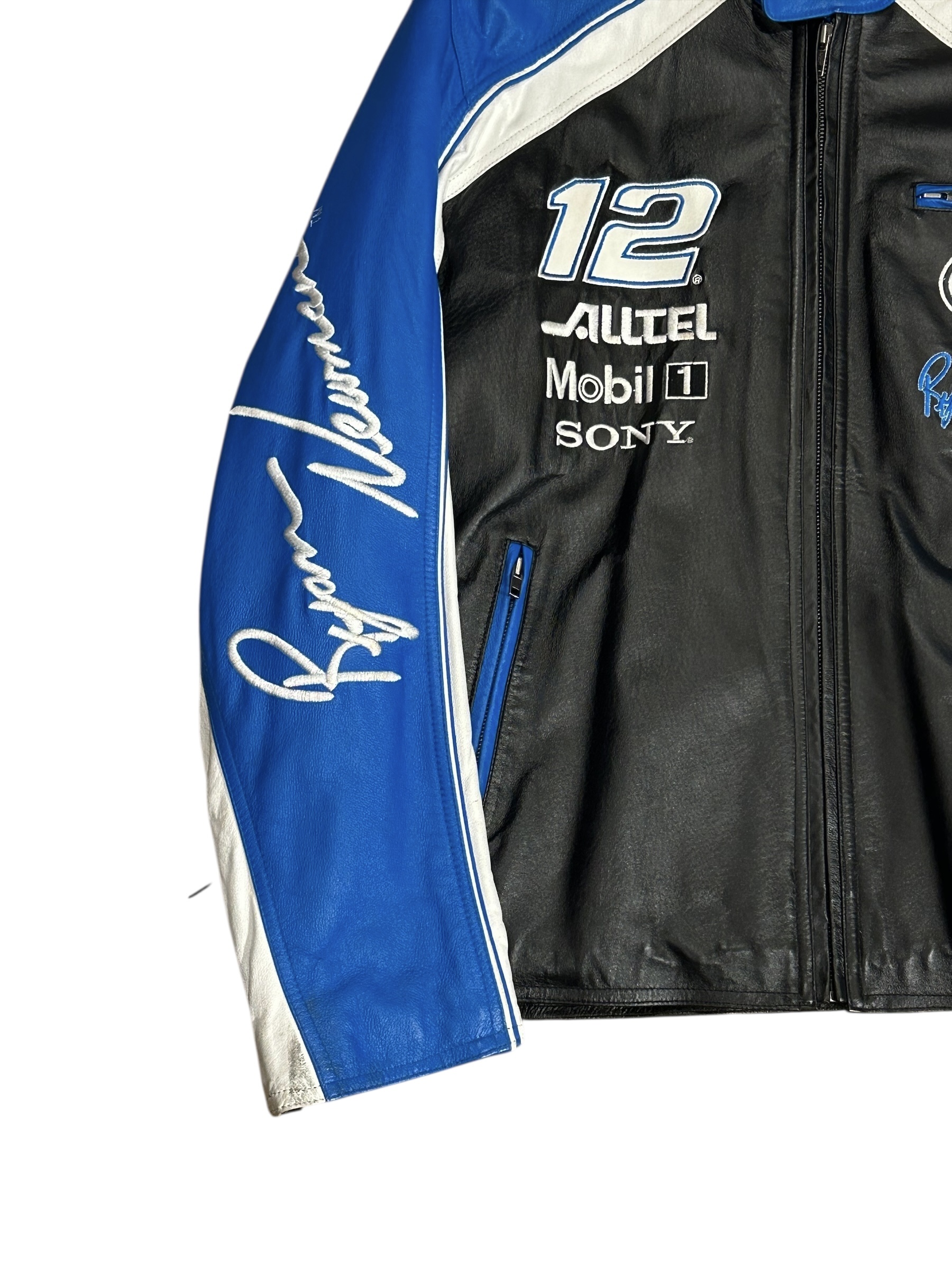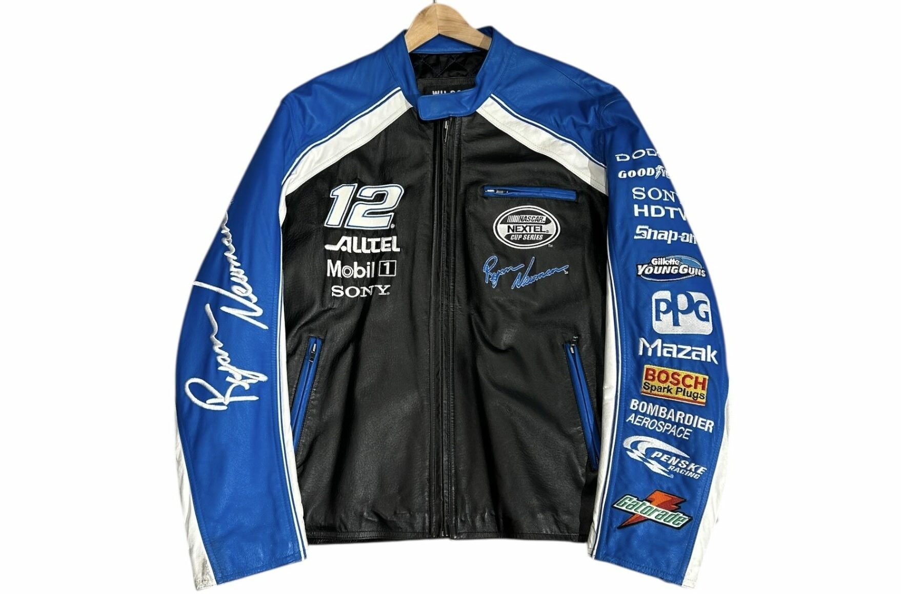 Posiada liczne haftowane i skórzane loga reklamowe charakterystyczne dla kurtek Nascar.