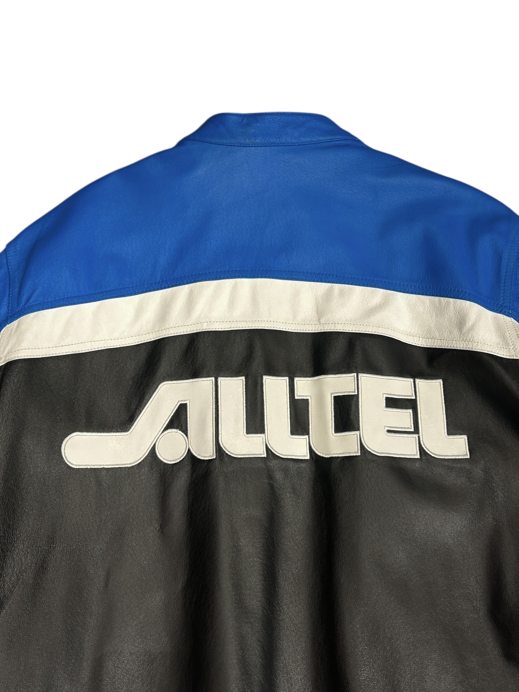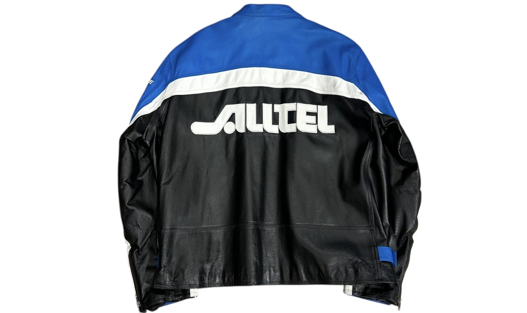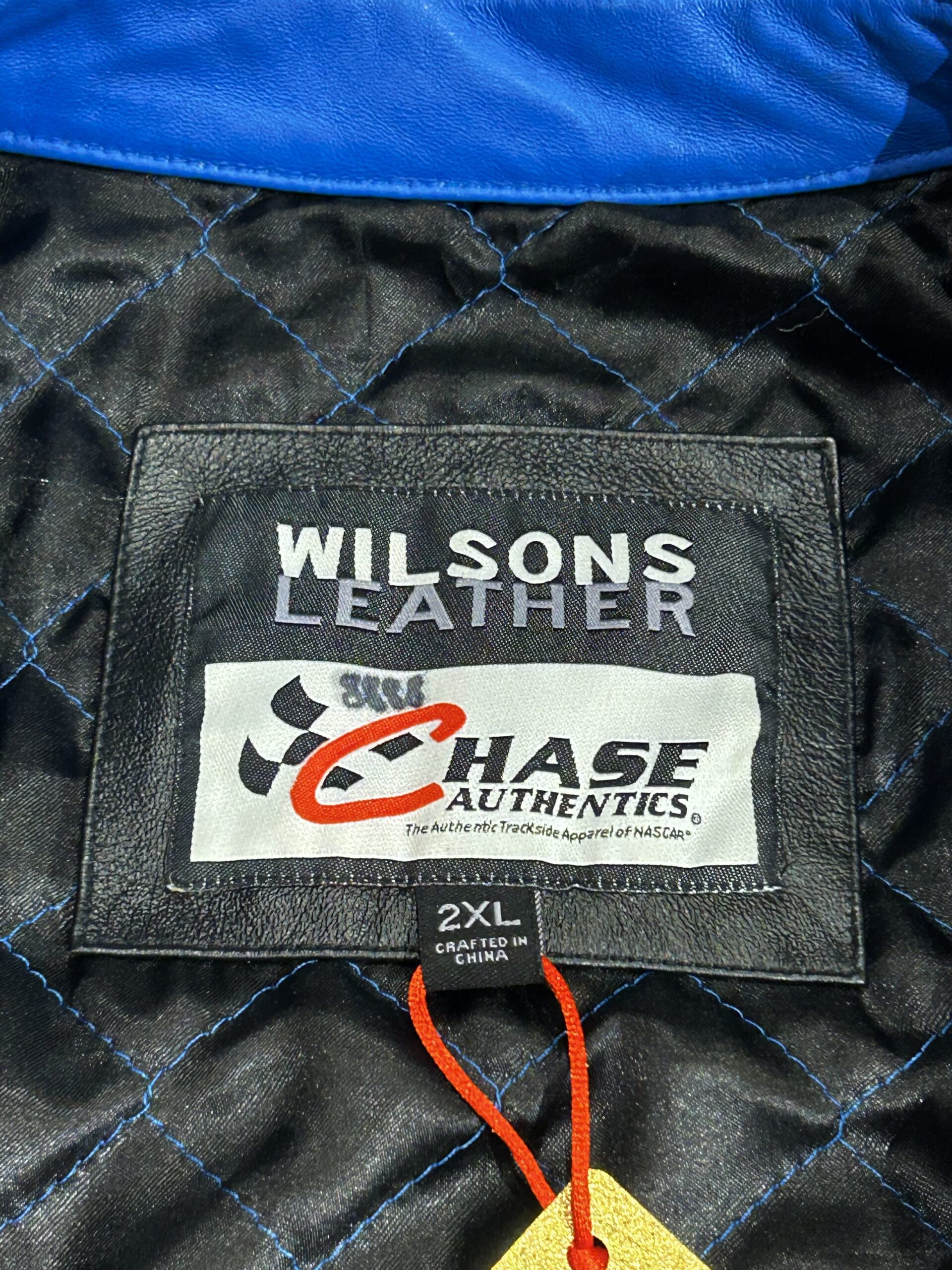 Posiada liczne haftowane i skórzane loga reklamowe charakterystyczne dla kurtek Nascar.