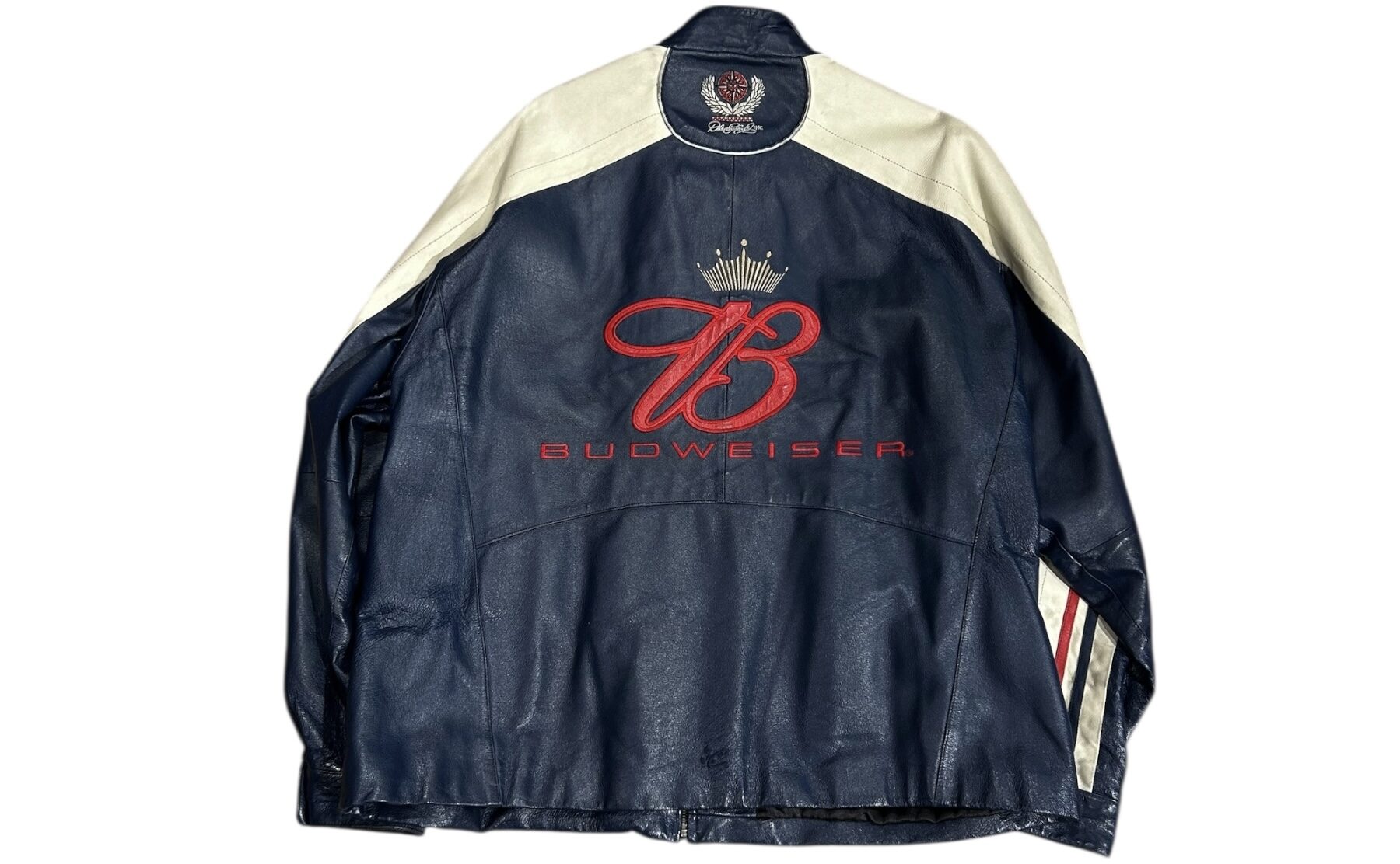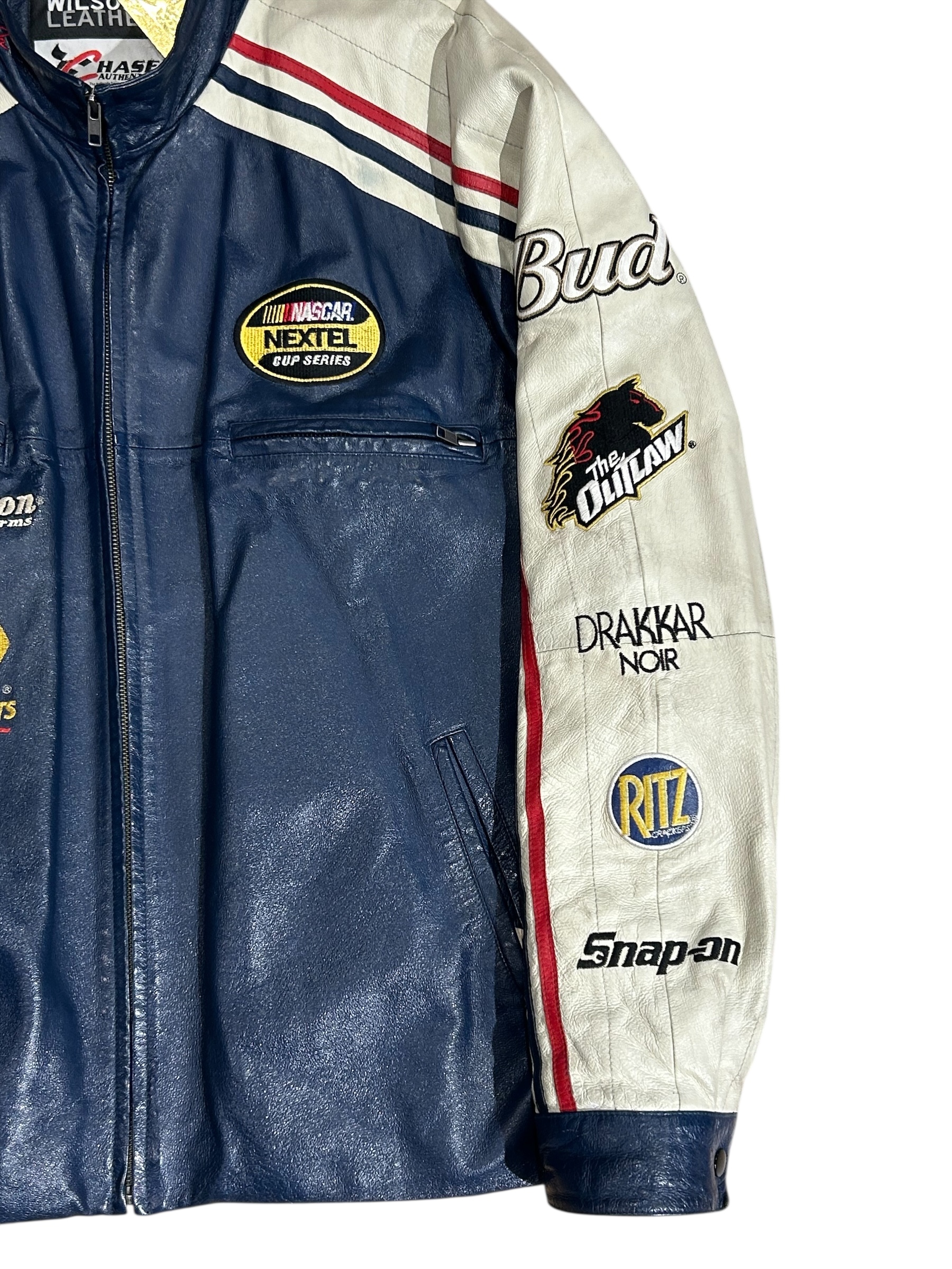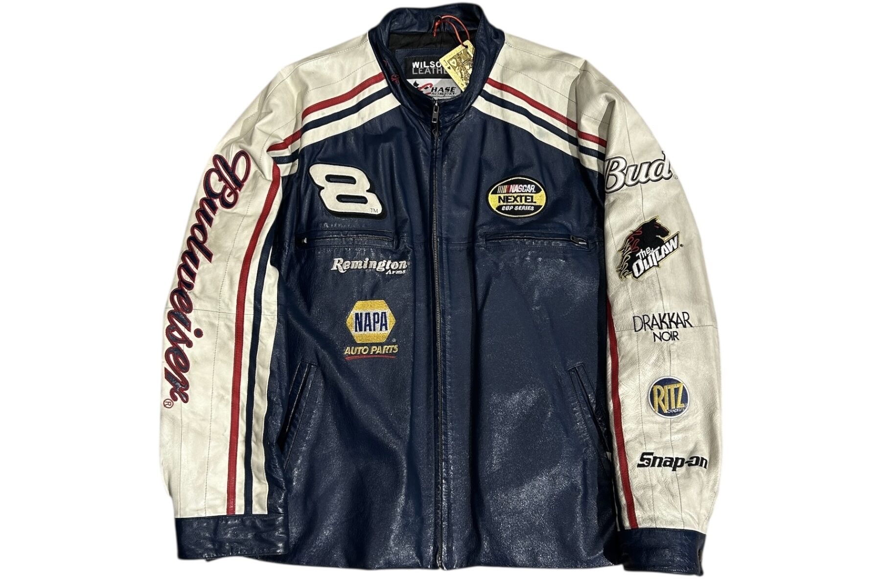 Posiada liczne skórzane i haftowane loga reklamowe charakterystyczne dla kurtek Nascar.