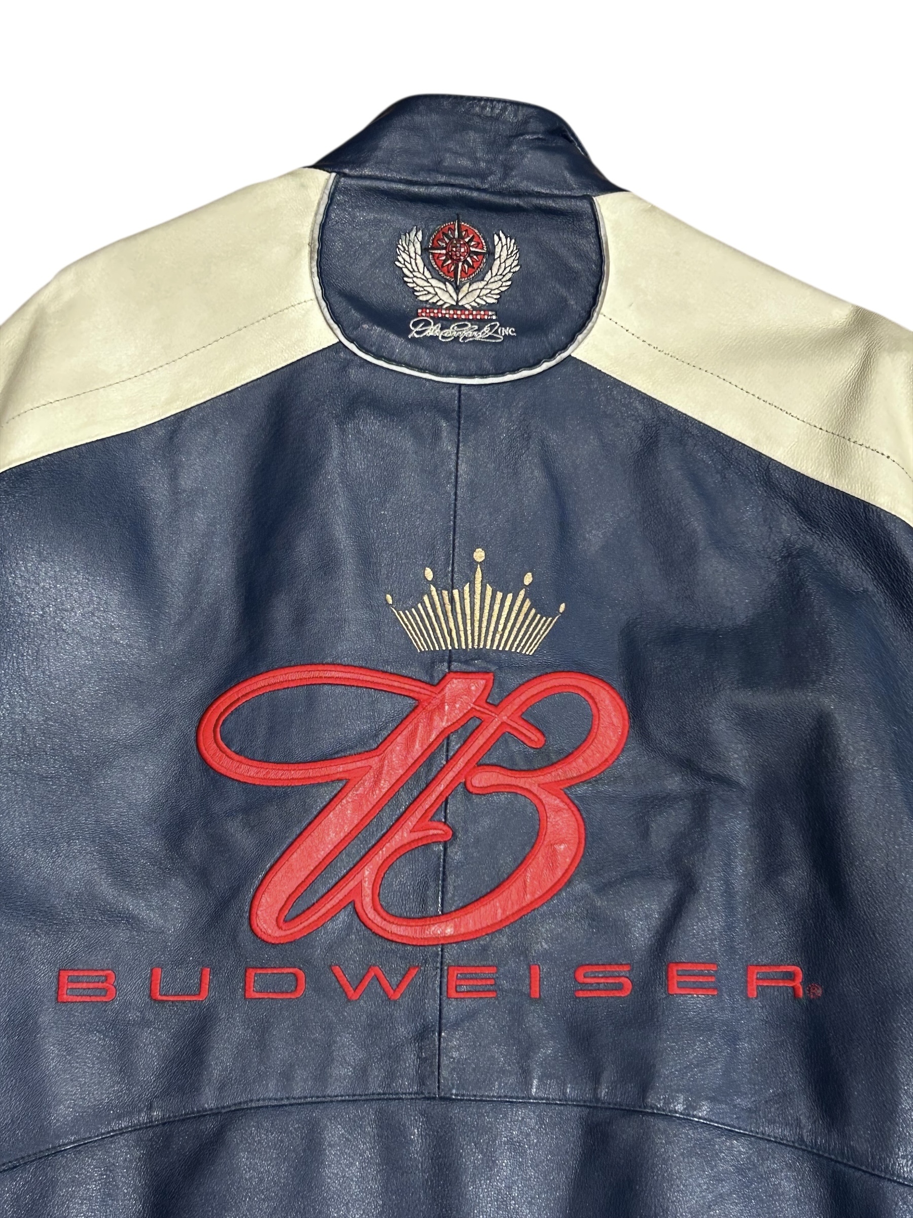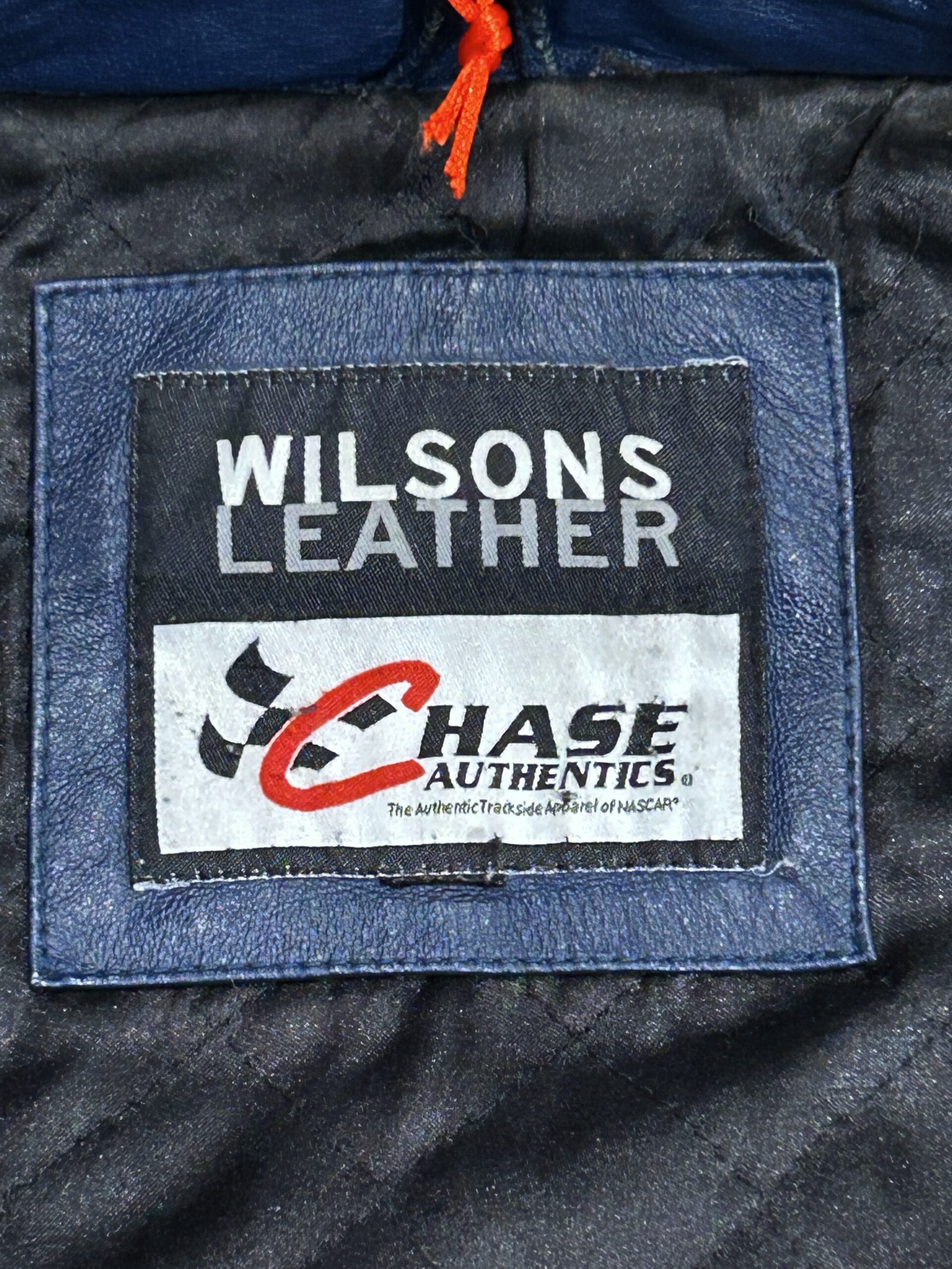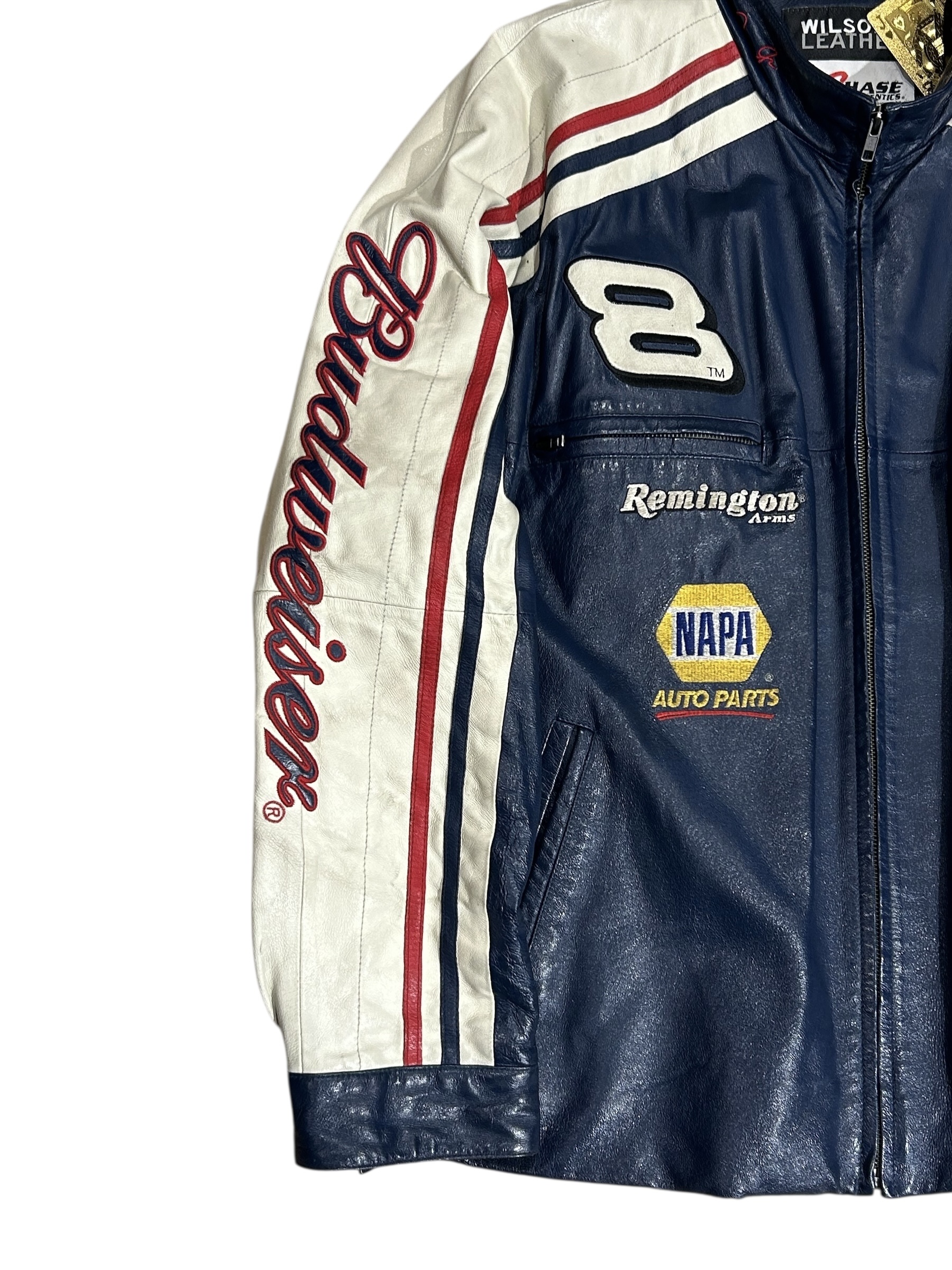 Posiada liczne skórzane i haftowane loga reklamowe charakterystyczne dla kurtek Nascar.