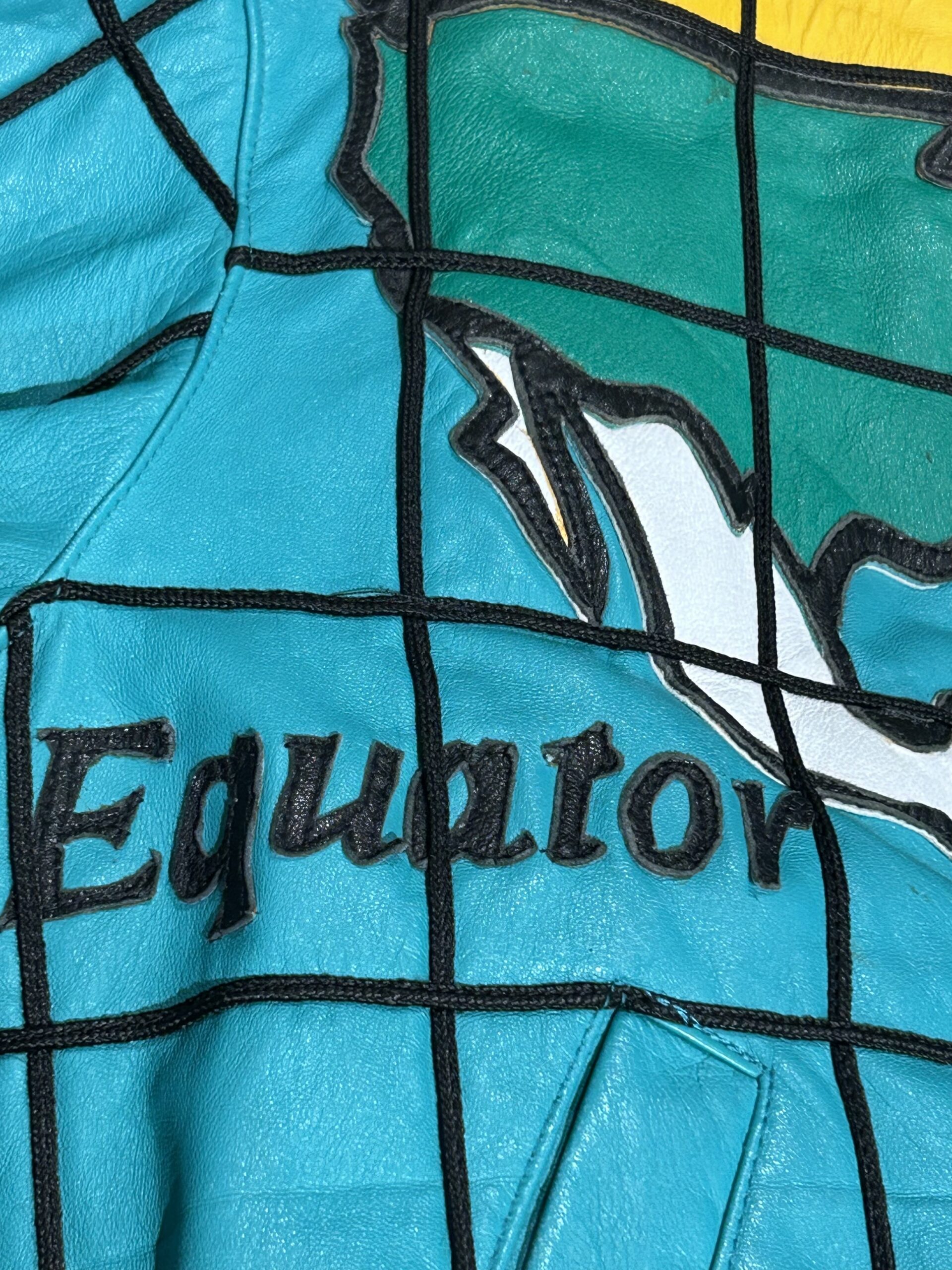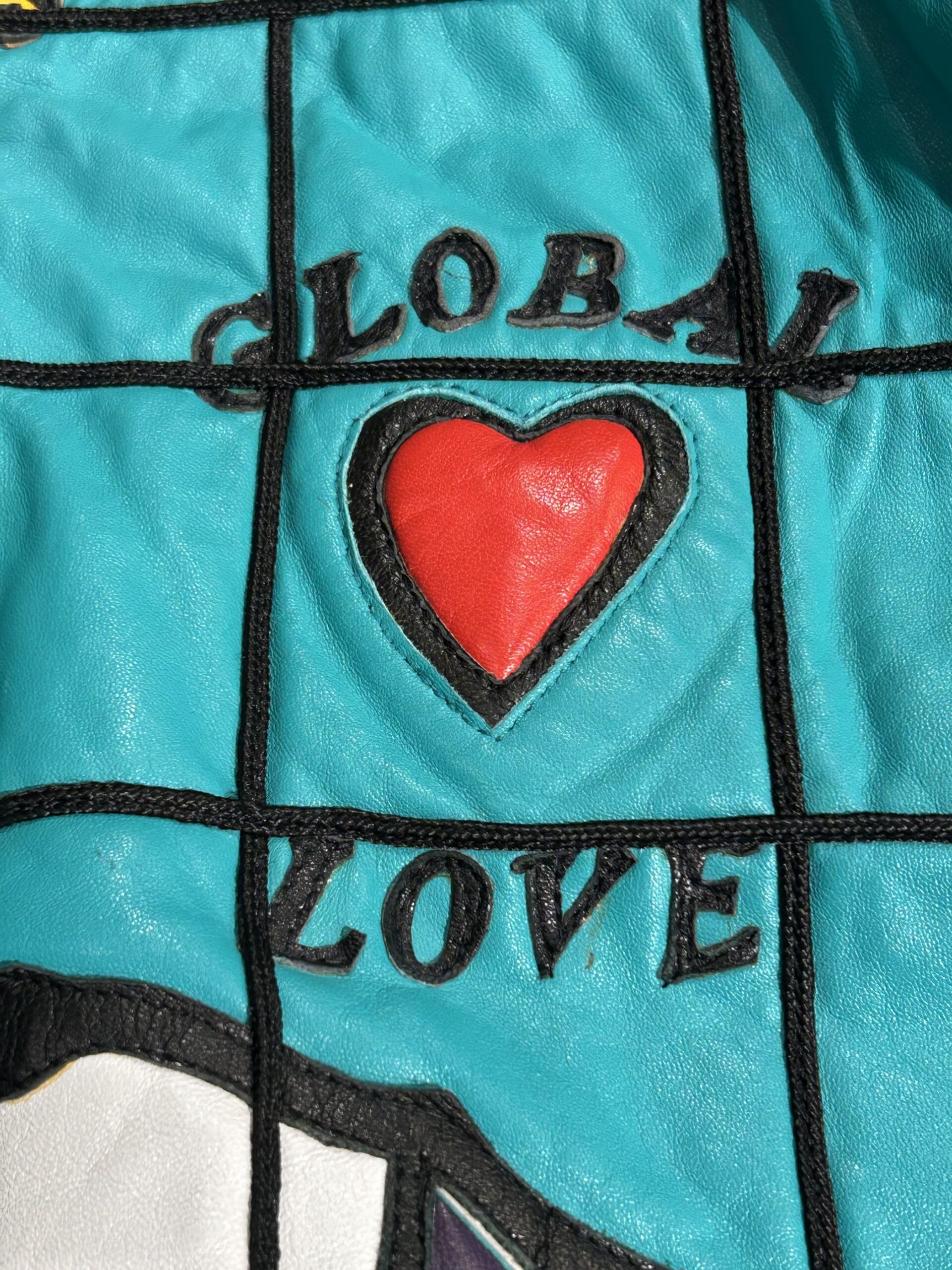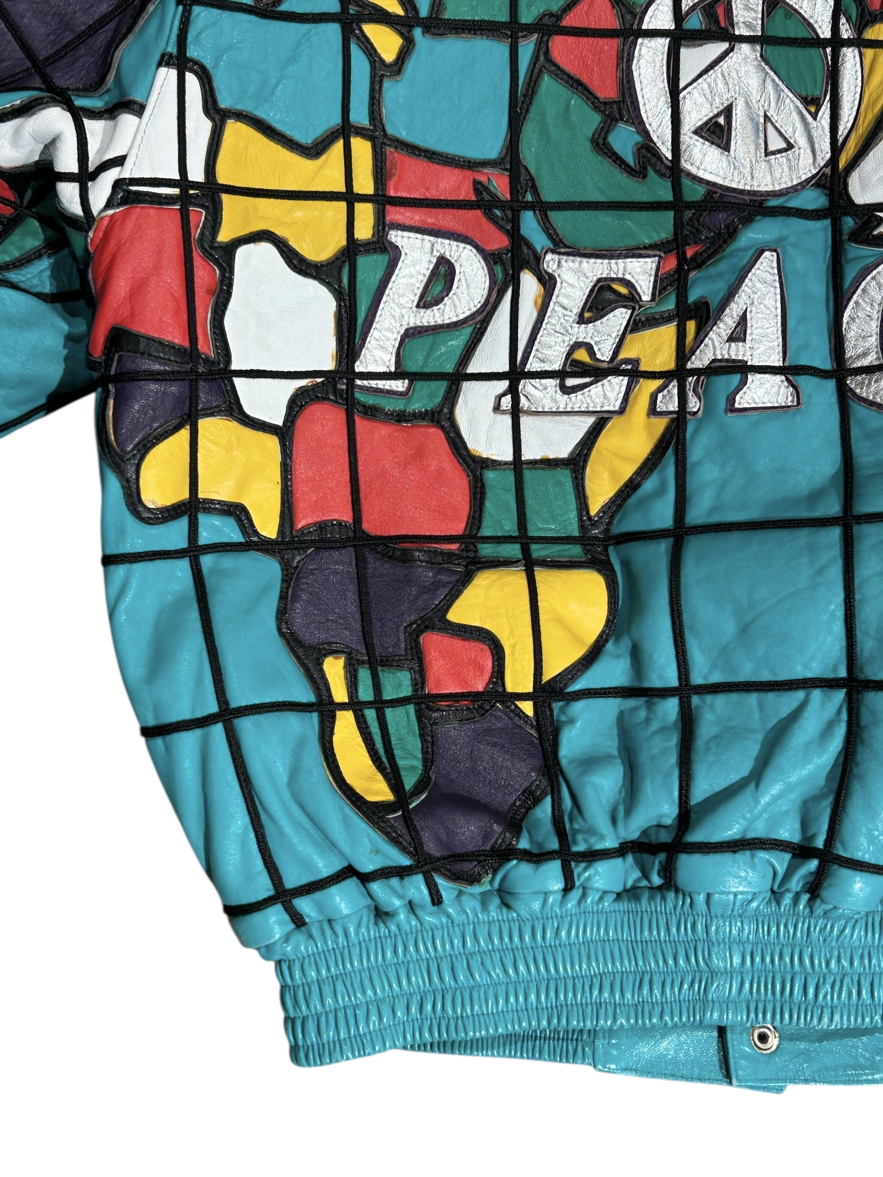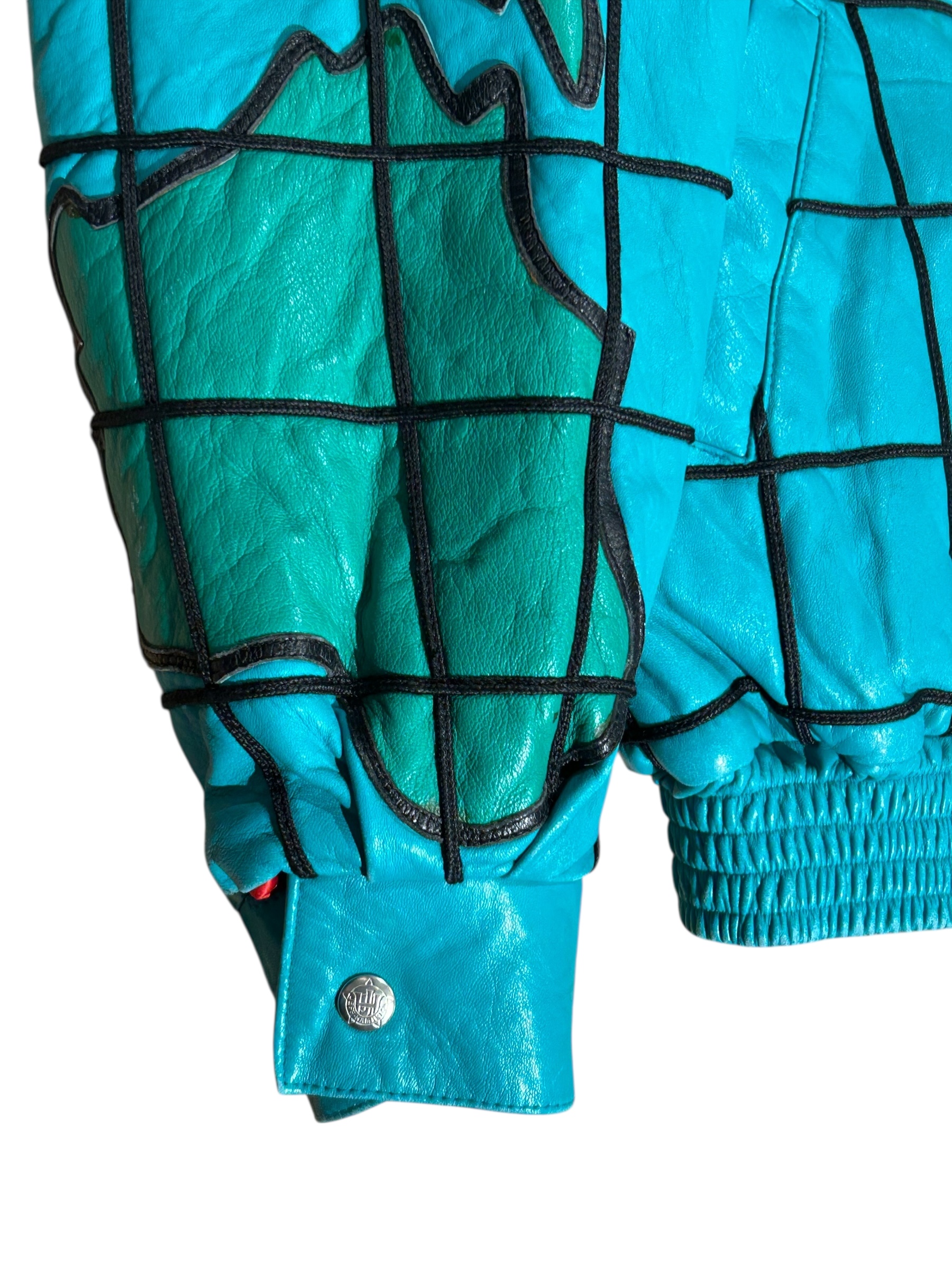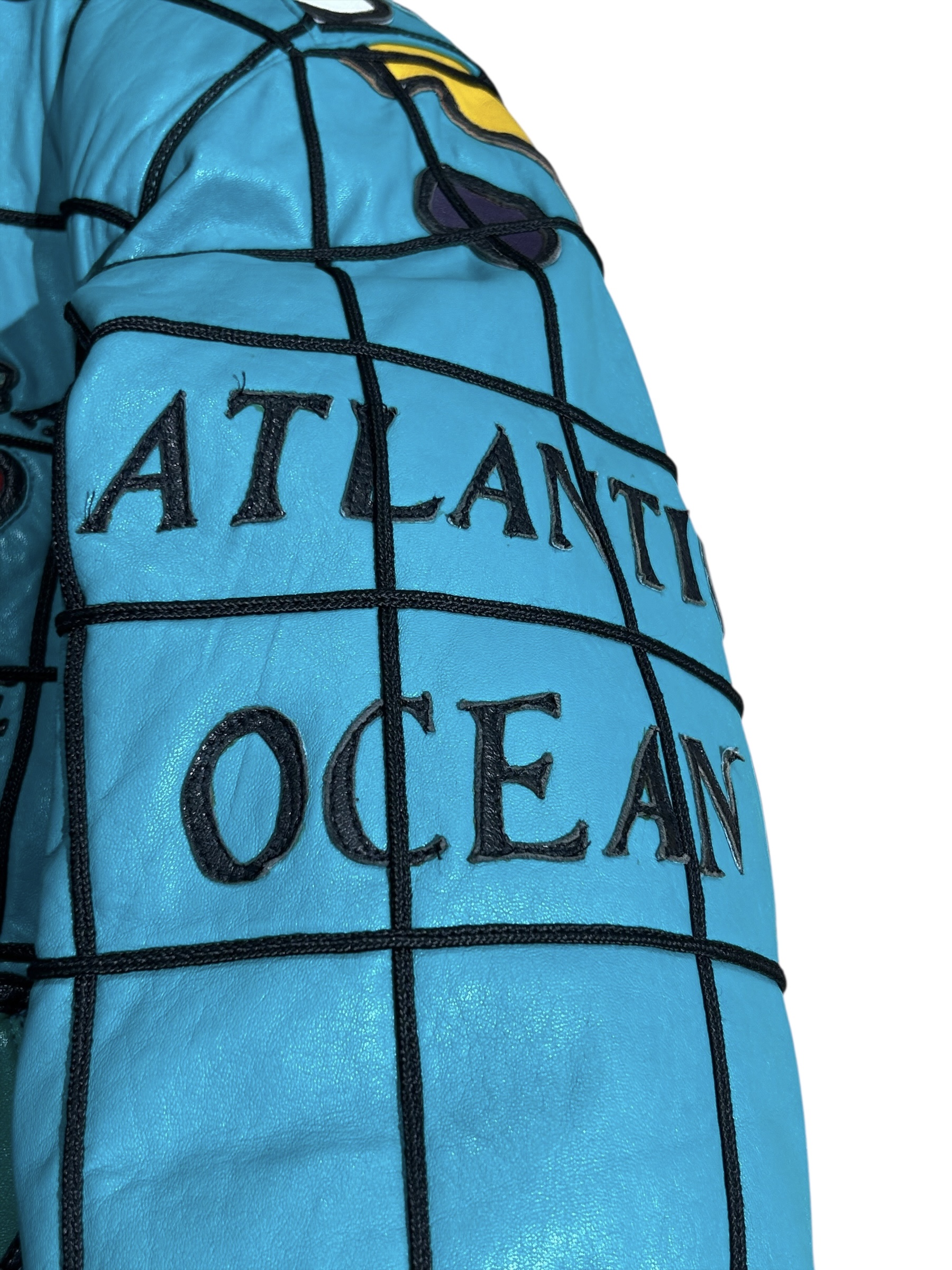 Całość kurtki z motywem mapy świata wykonana ze skóry naturalnej.