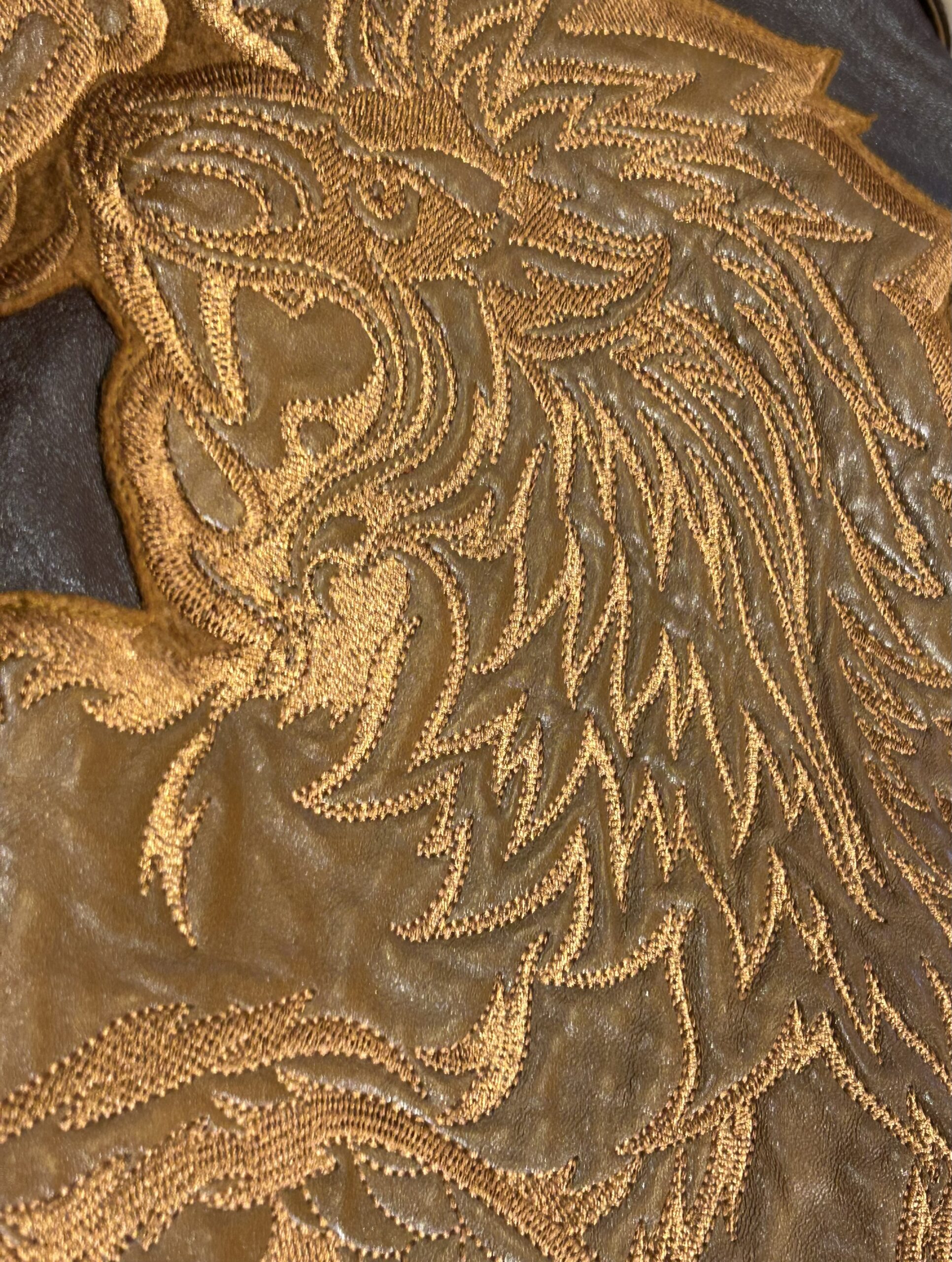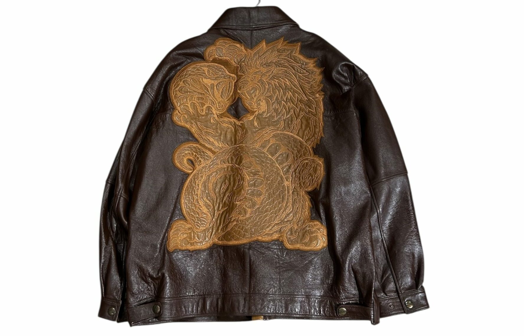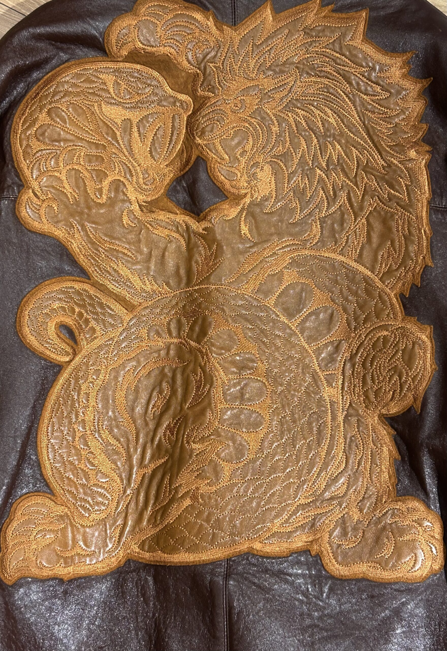 Haftowany motyw smoka na plecach oraz węża na piersi.