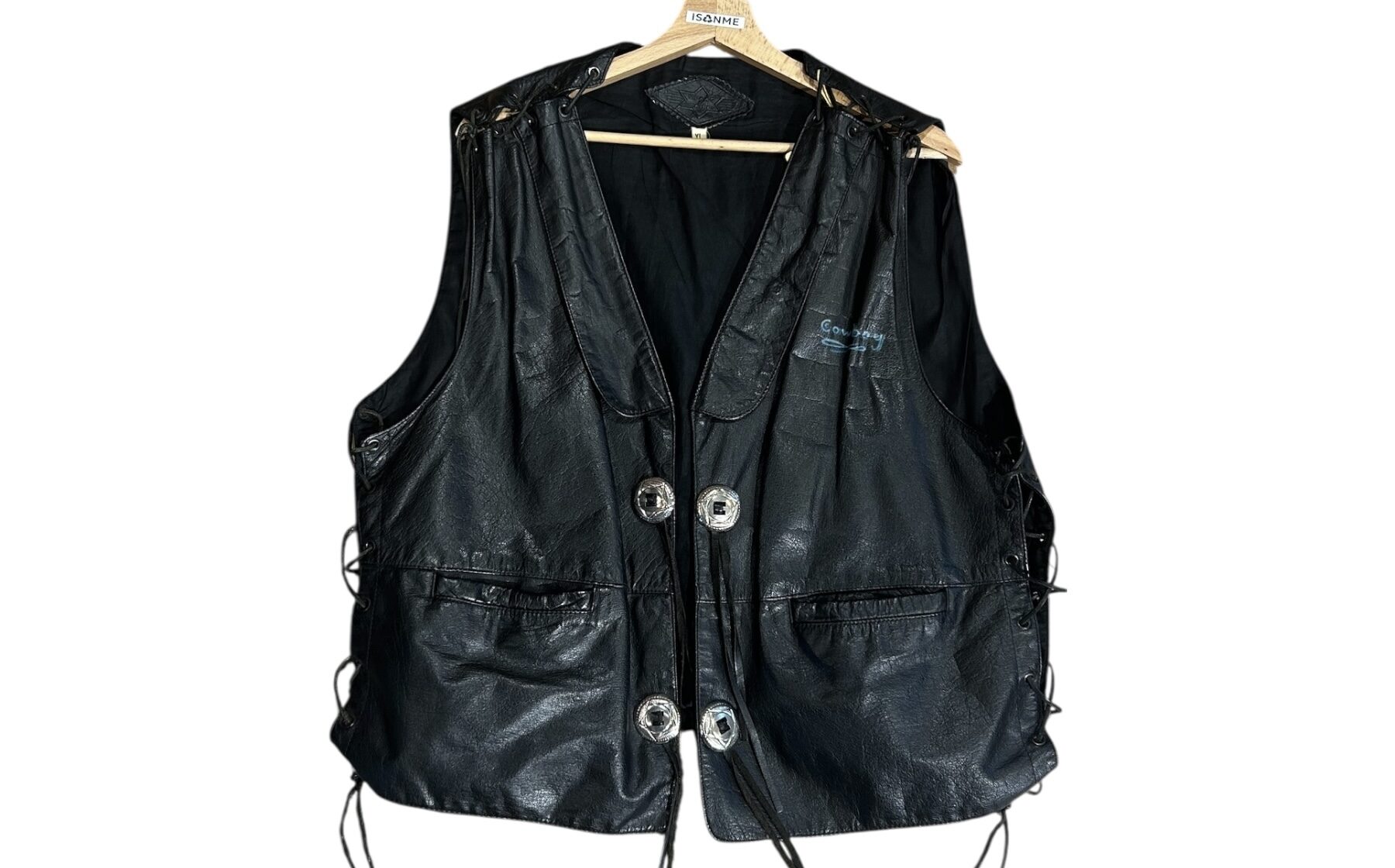 Kamizelka skórzana wykonana w latach 90. Elementy kamizelki połączone są ze sobą sznurowaniami.
