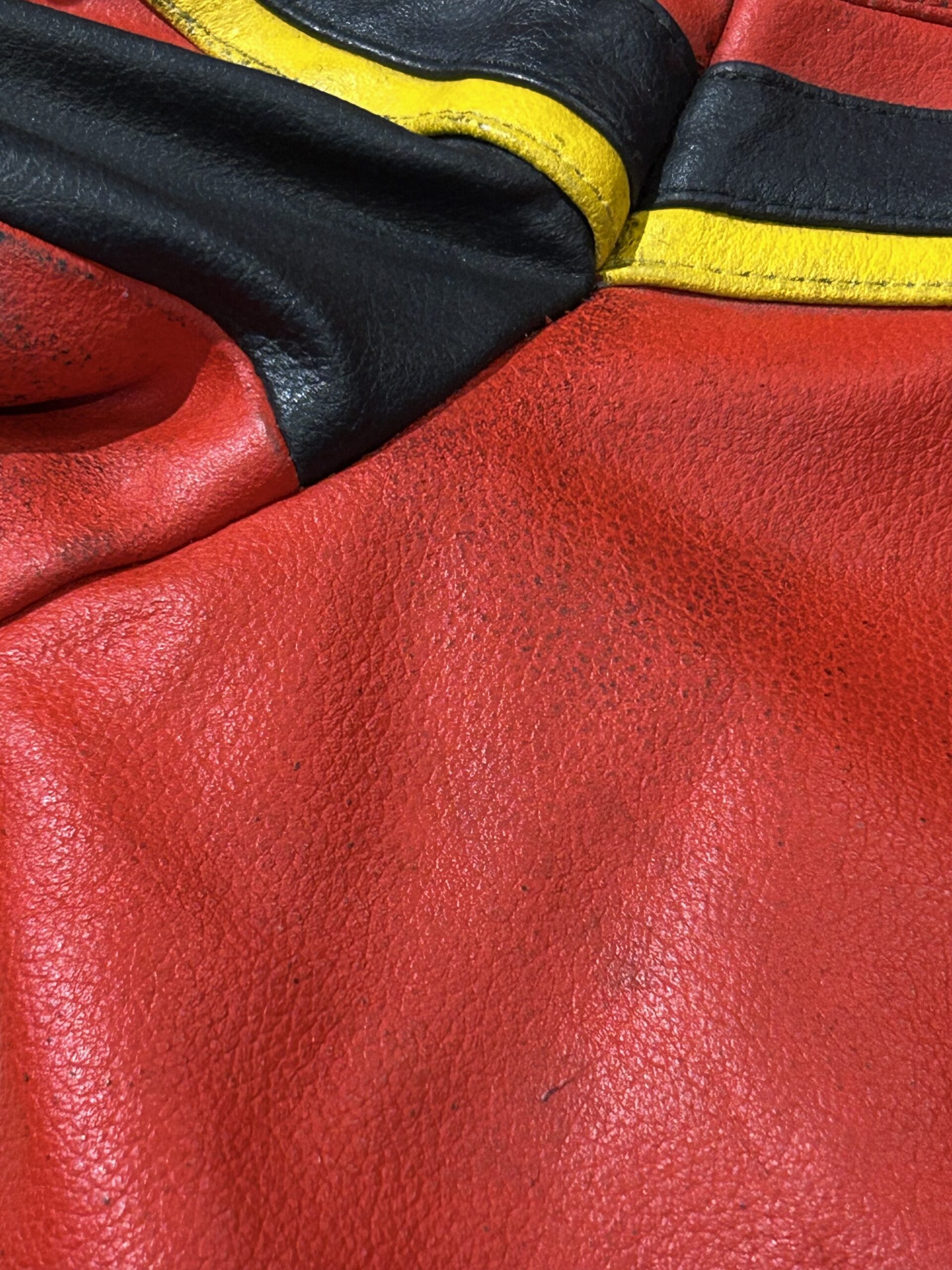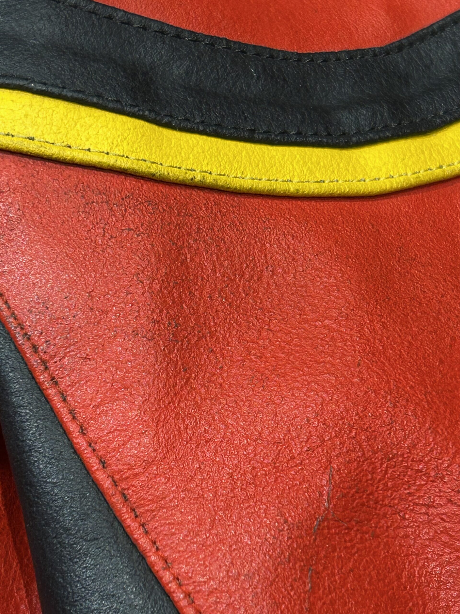 Bardzo ciężka i gruba kurtka z dodatkową warstwą skóry na łokciach oraz barkach.