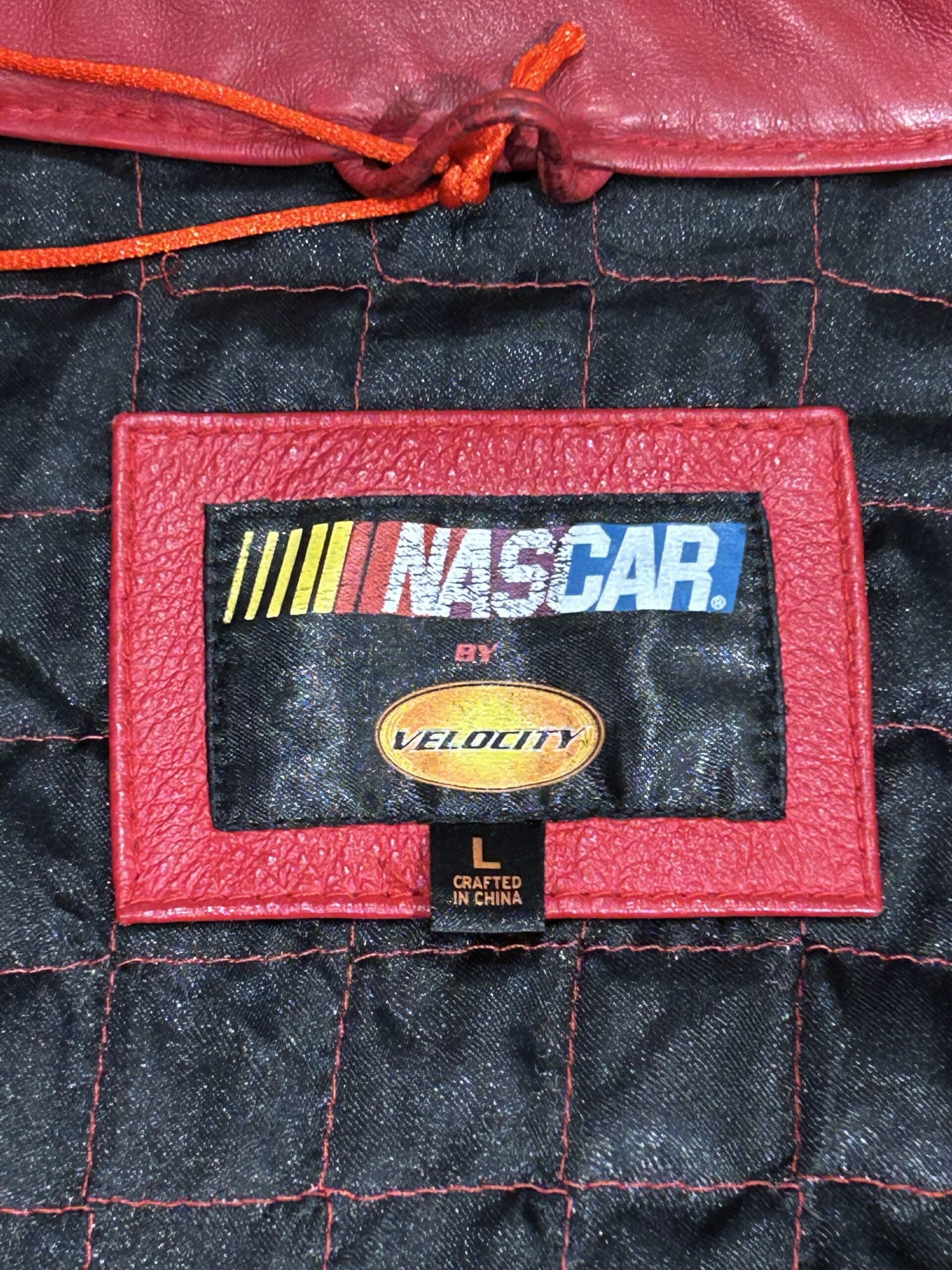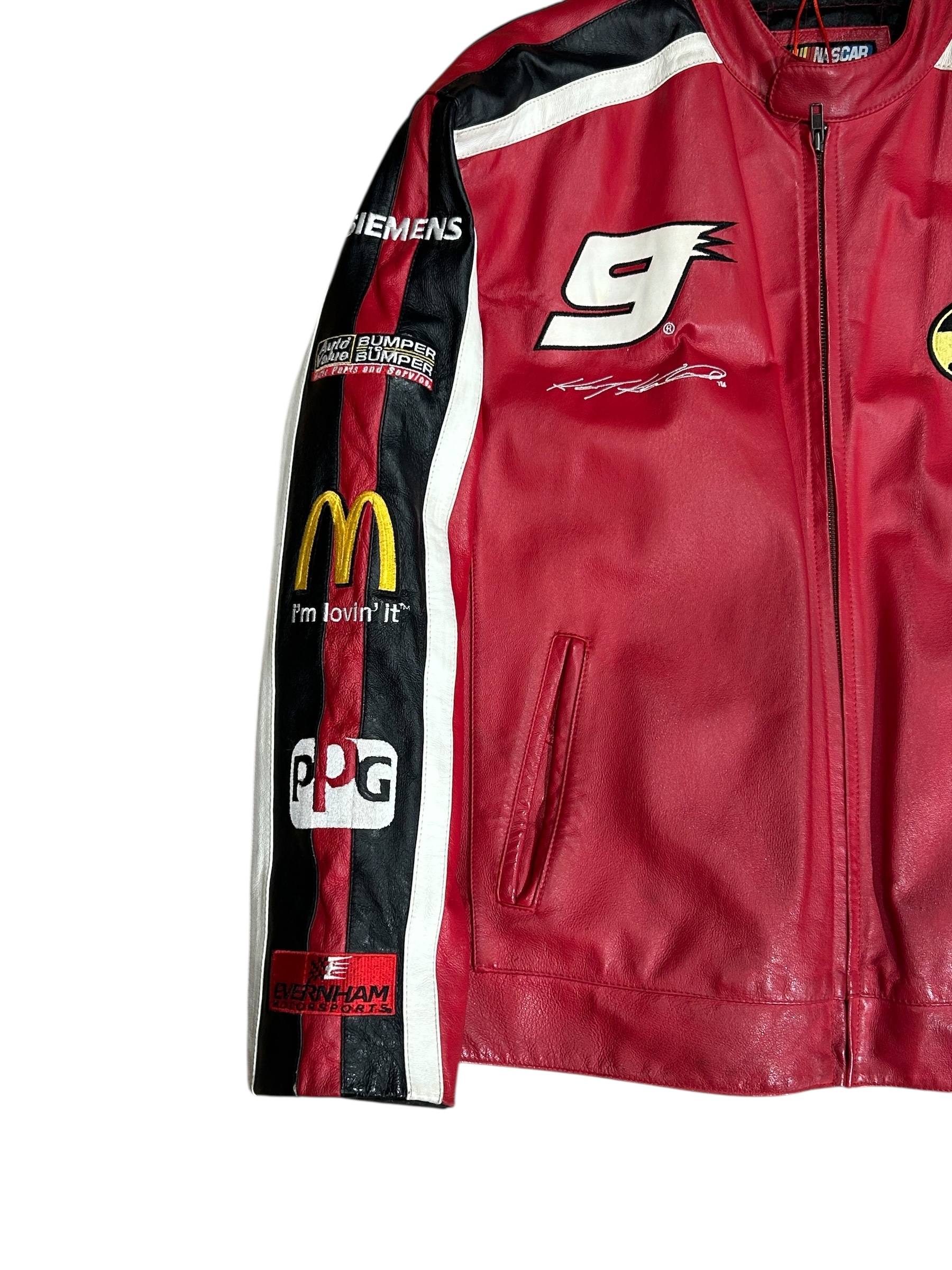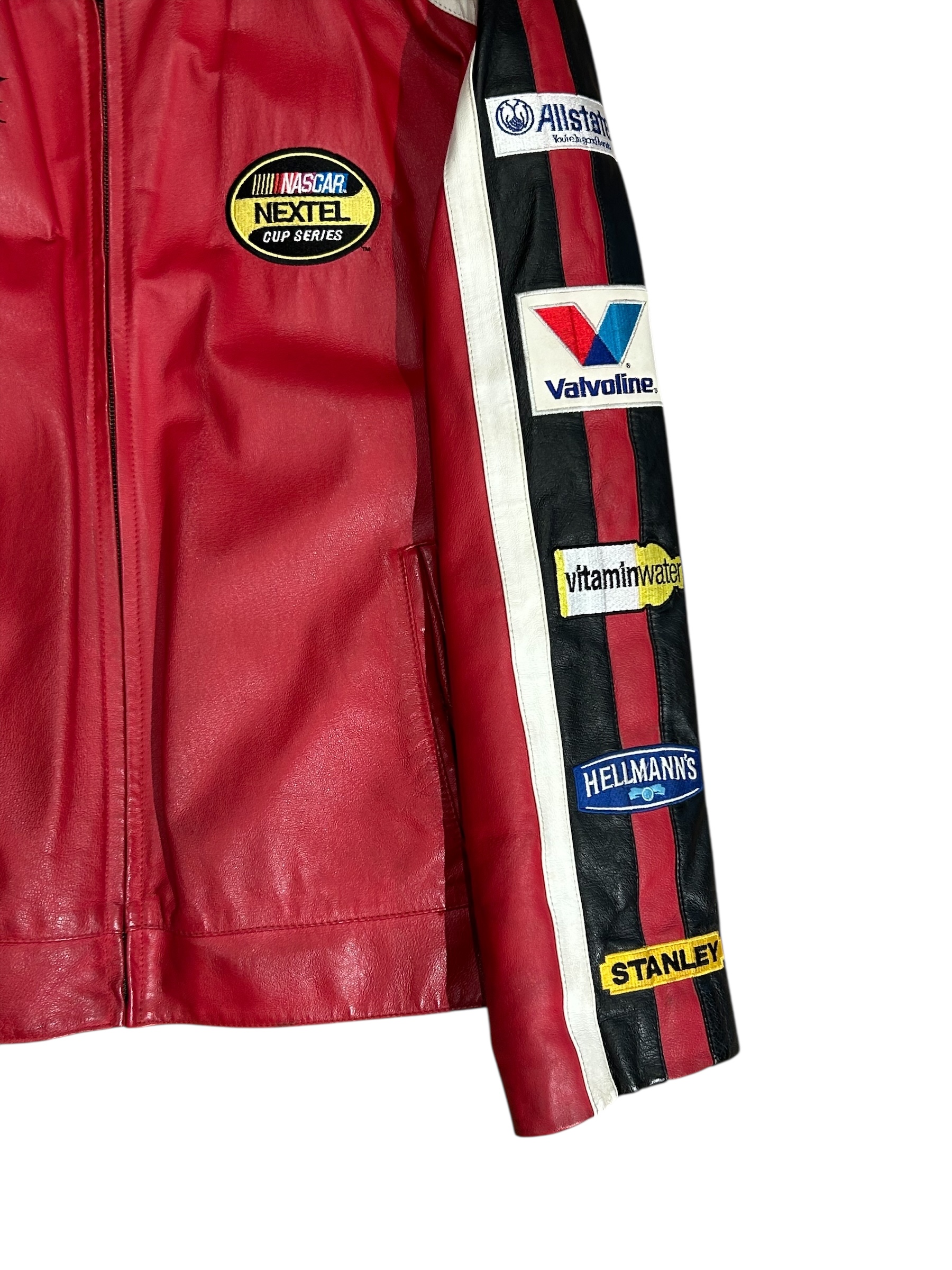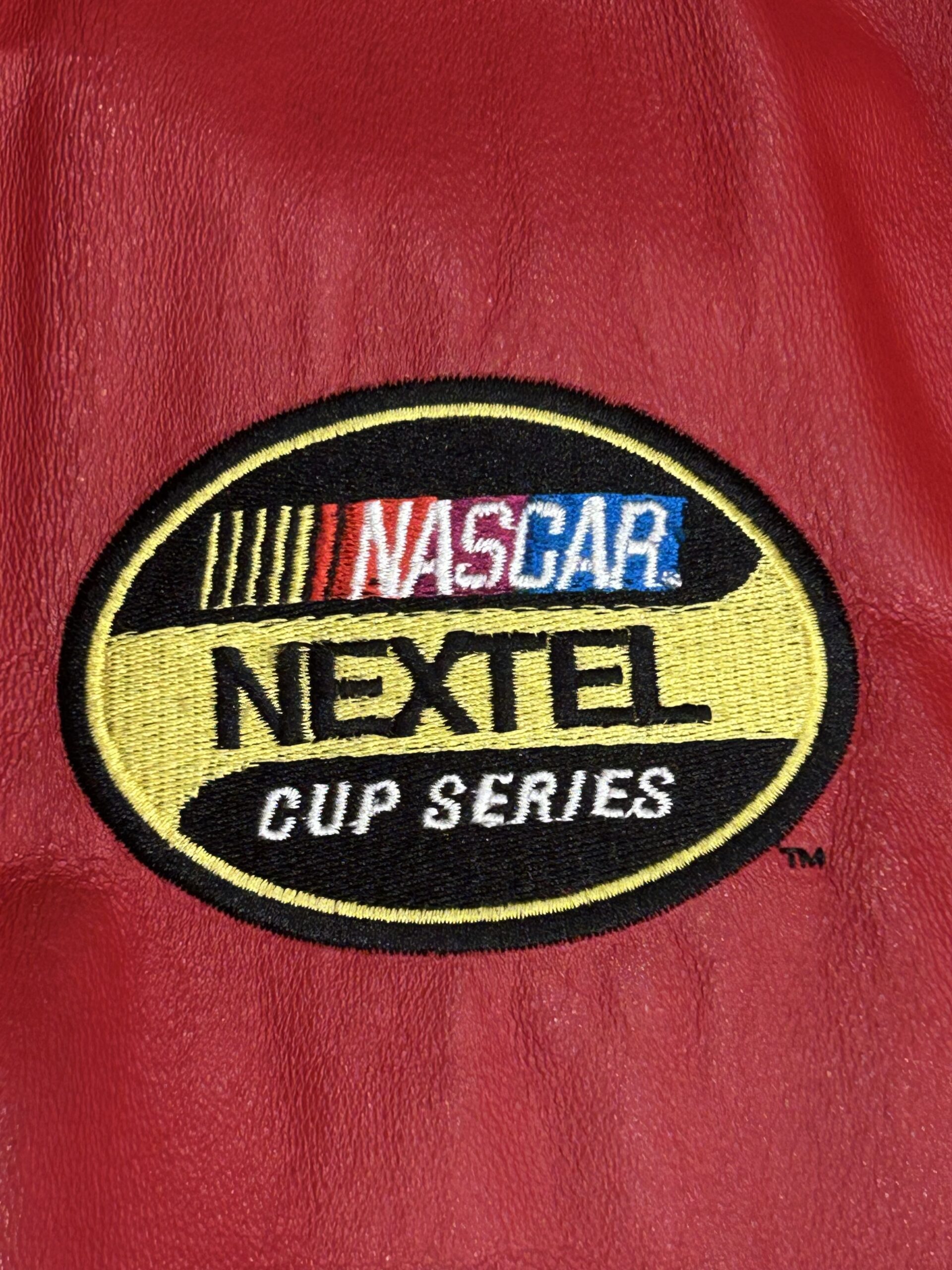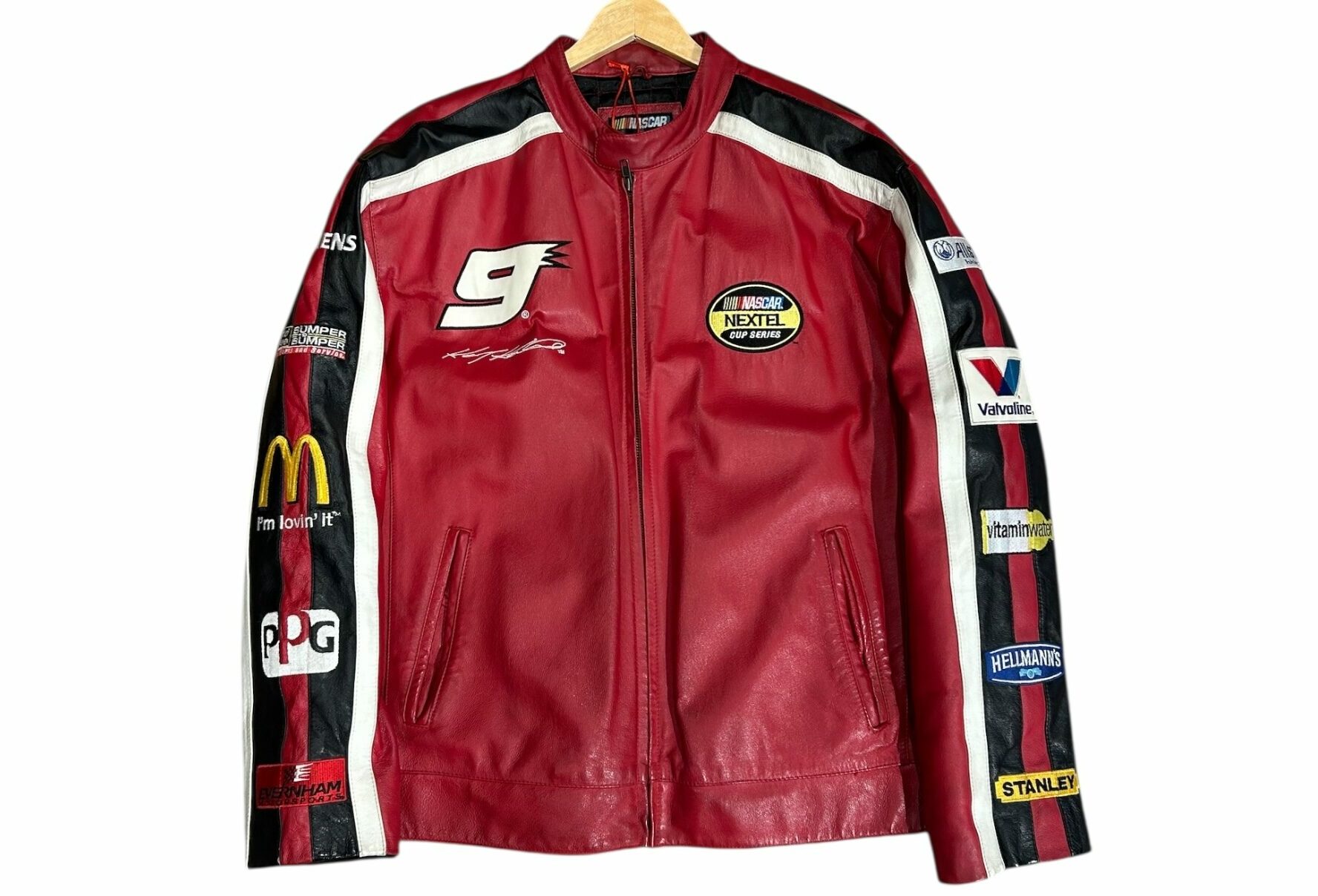 Posiada liczne haftowane i skórzane loga reklamowe charakterystyczne dla kurtek Nascar.