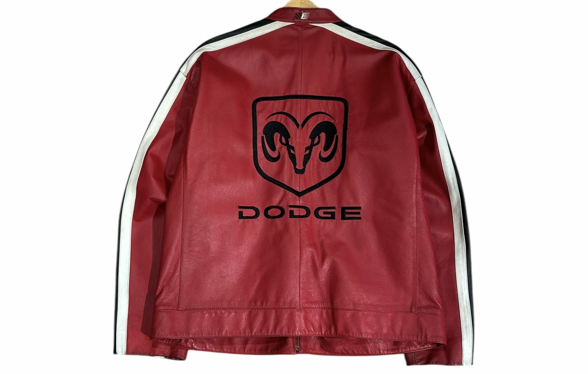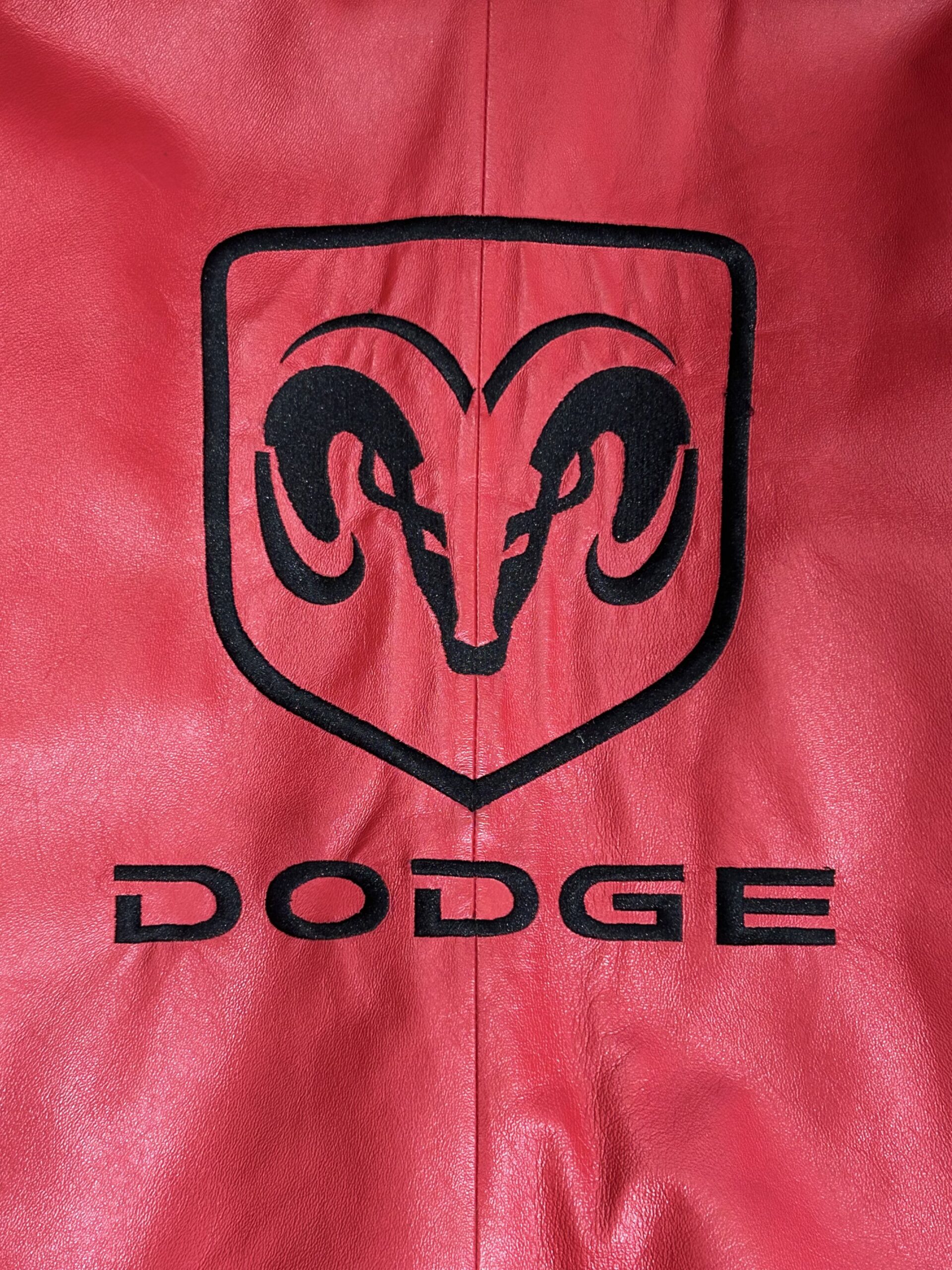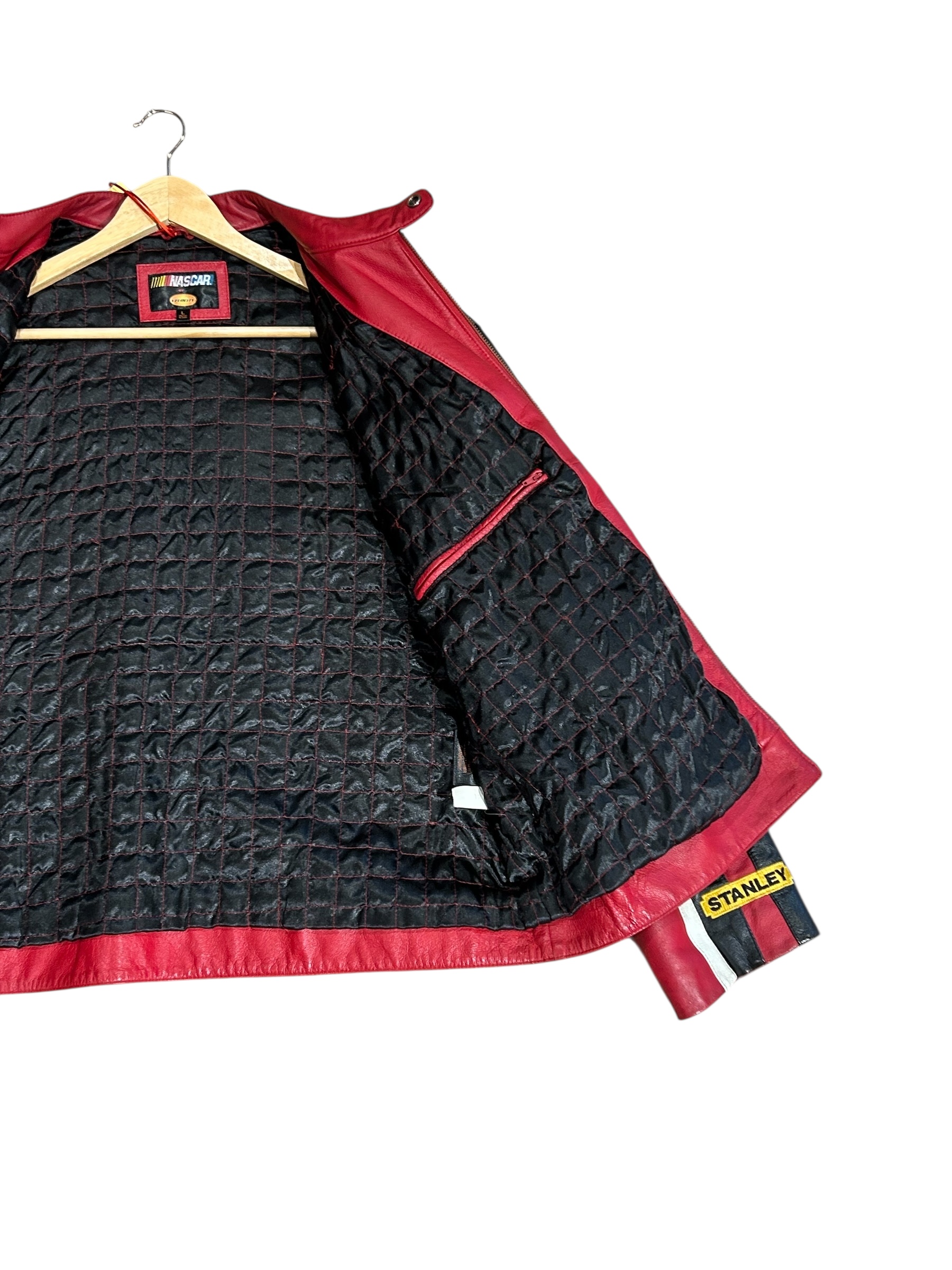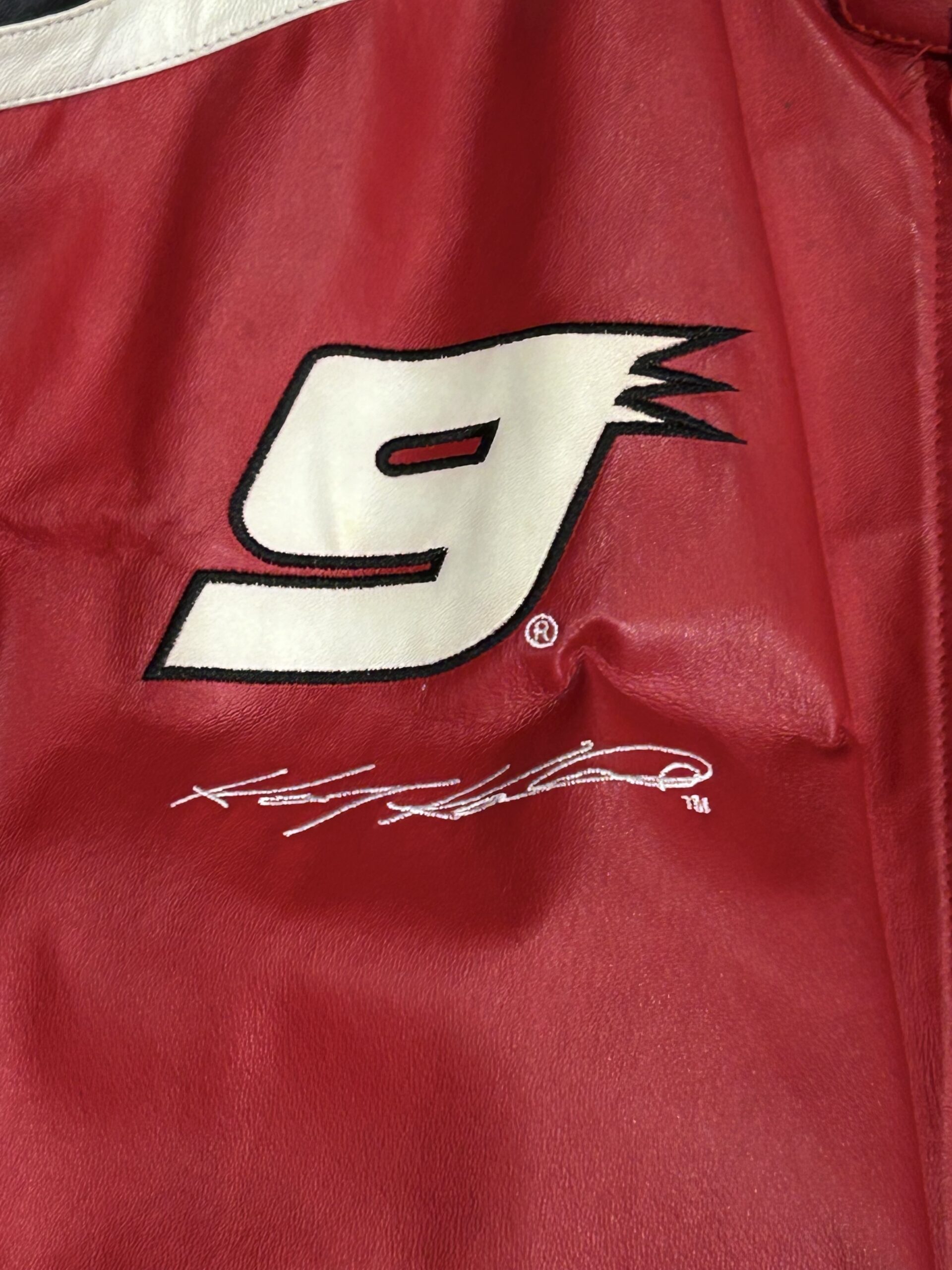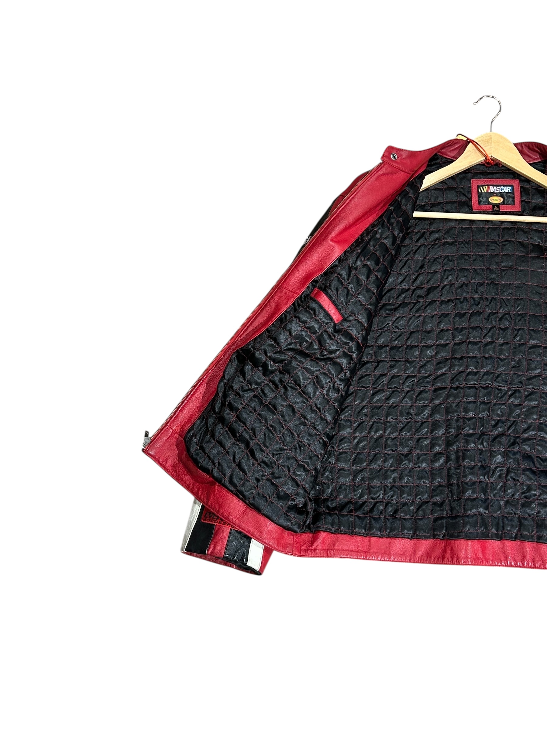 Posiada liczne haftowane i skórzane loga reklamowe charakterystyczne dla kurtek Nascar.